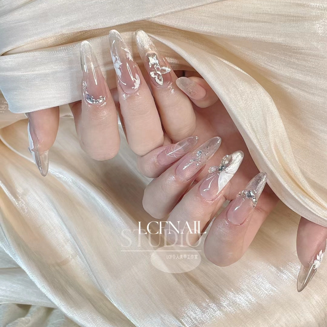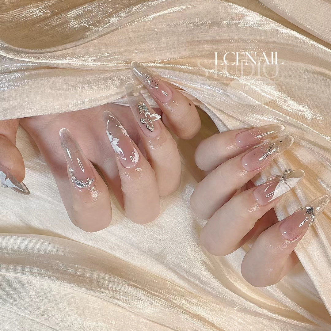 377手工定制成品假指甲光疗穿戴甲蝴蝶手绘花卉美甲孕妇新娘显白