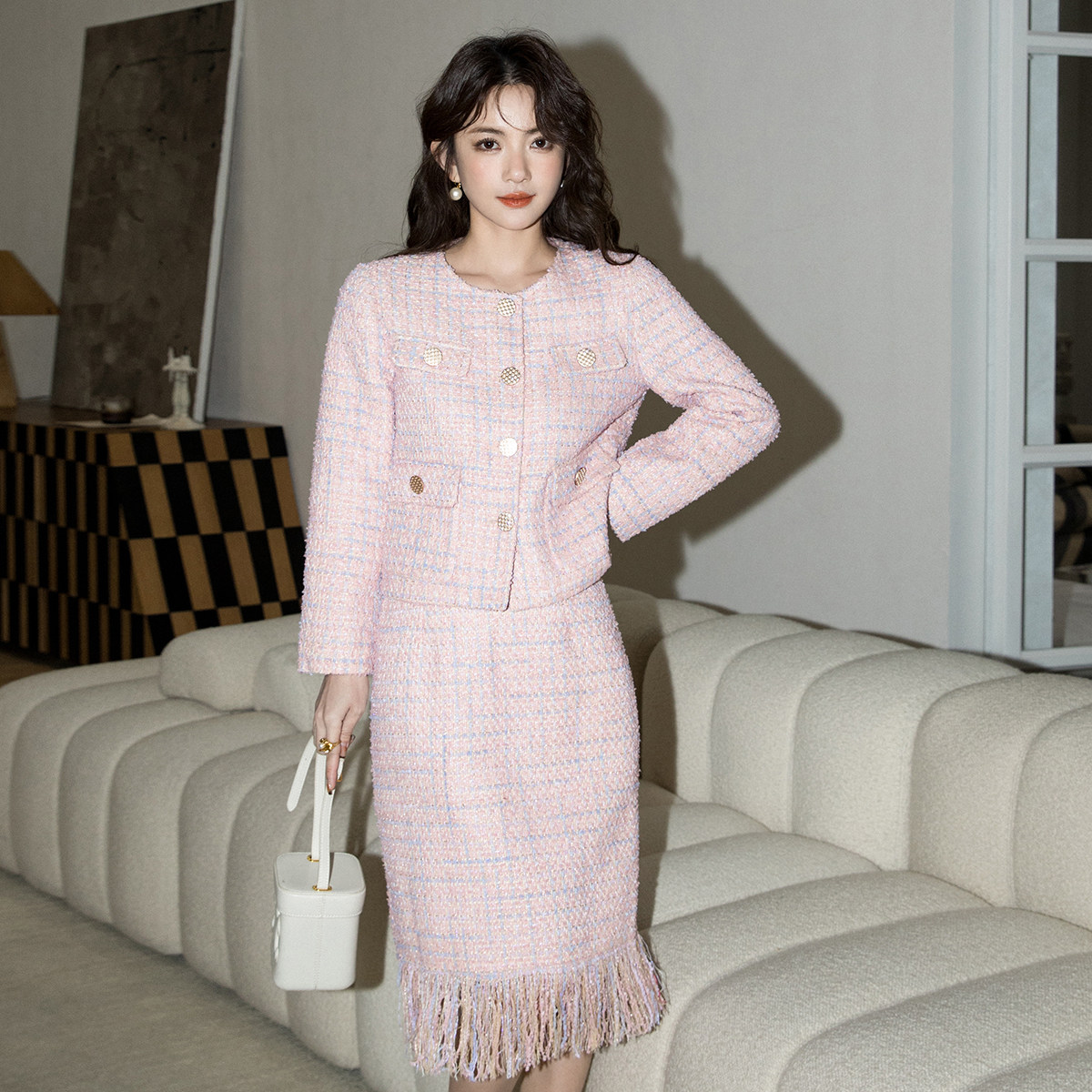 2504 肌理感套裙 bling粉色小香风外套女重工千金风气质短款 西装
