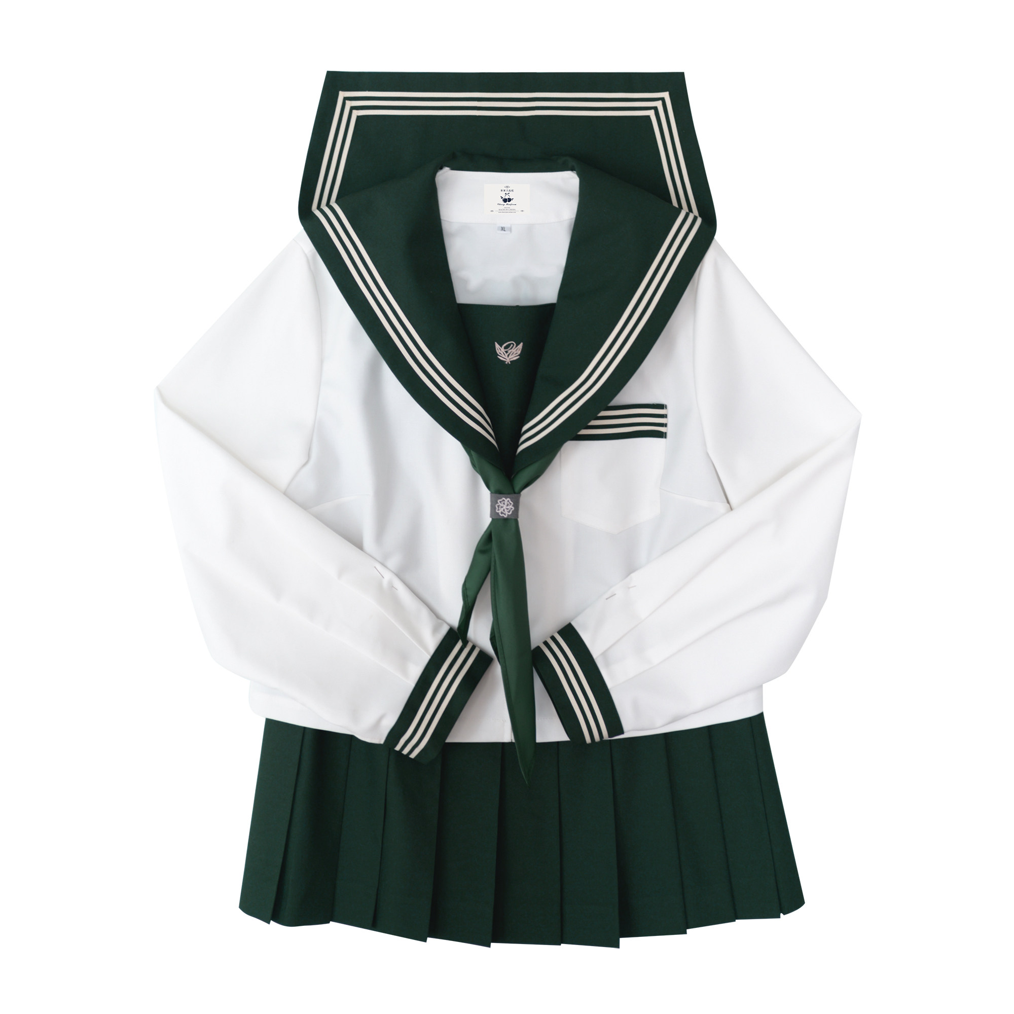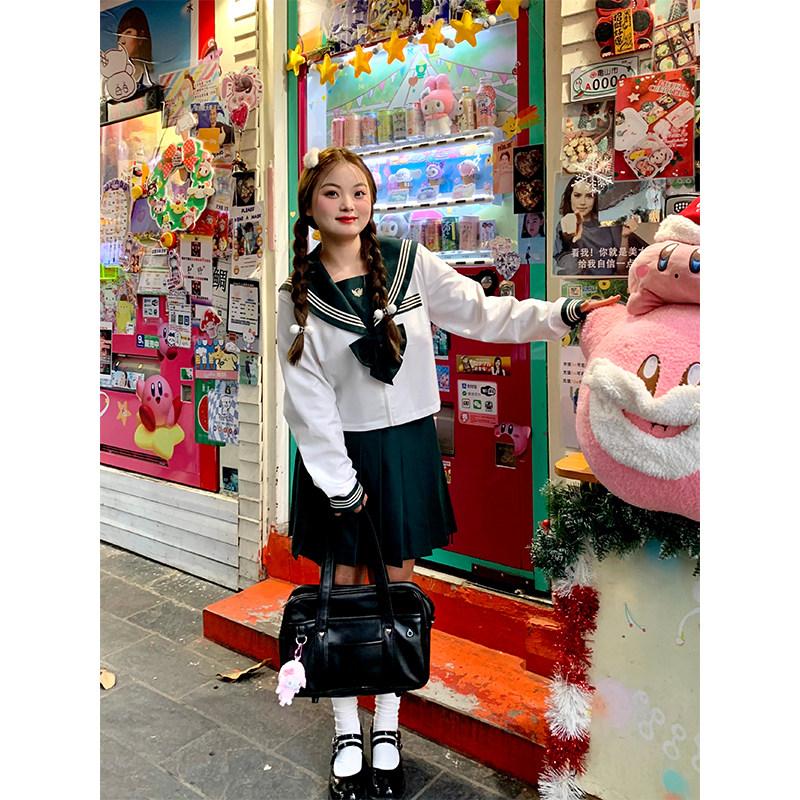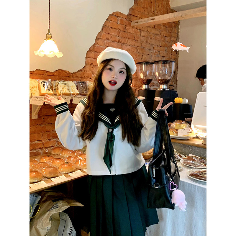 jk胖mm原创海军领绿三本水手服百褶裙显瘦学院风套装 阿车家 大码