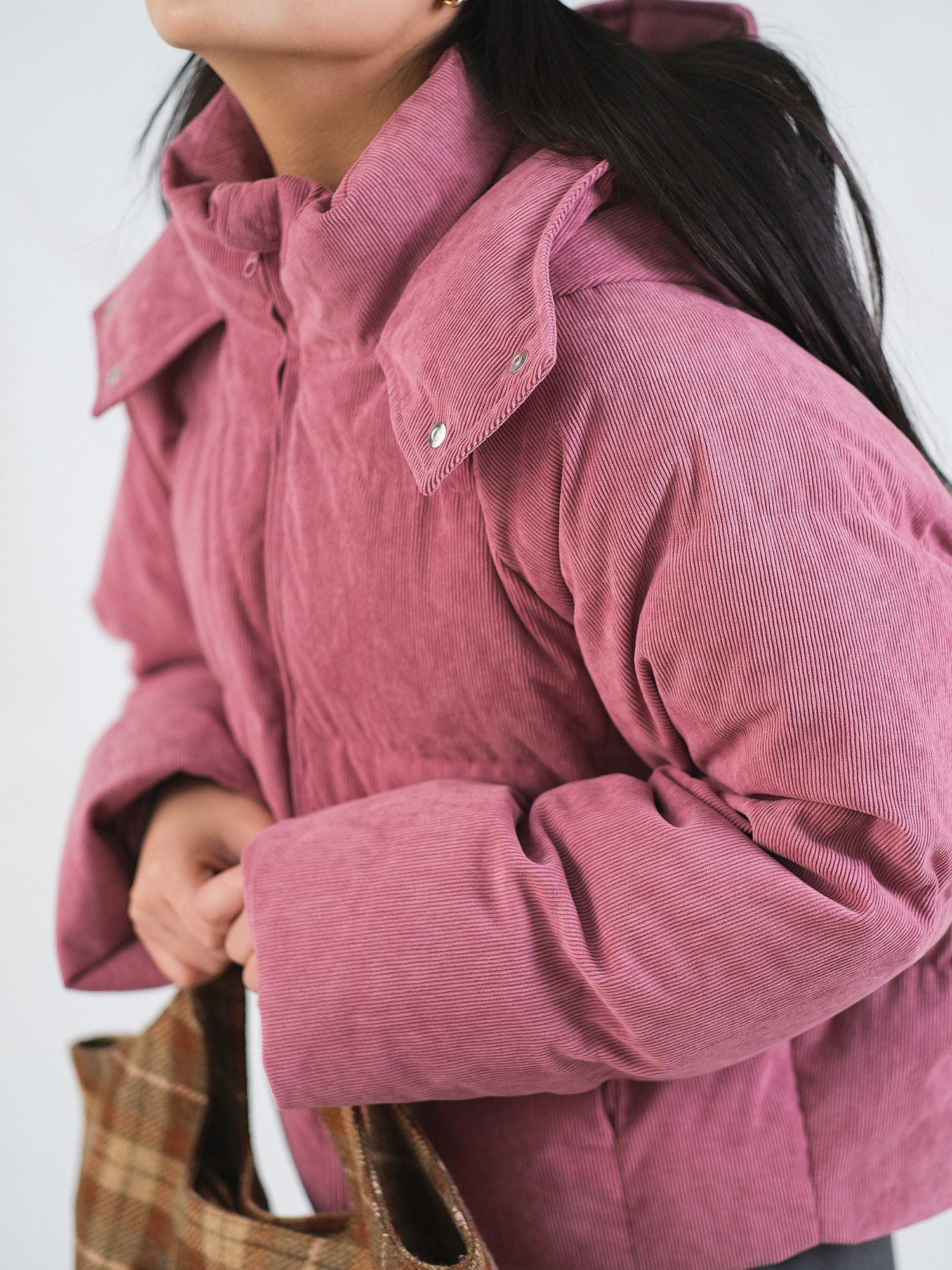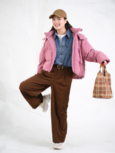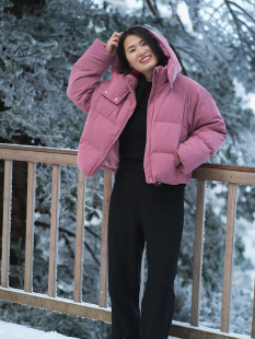远家90白鸭绒灯芯绒羽绒服粉色长袖 623限 宽松百搭保暖外套冬新W