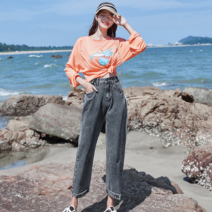 胖MM九分裤 高腰宽松显瘦2024复古做旧黑灰色大码 女春装 老爹牛仔裤