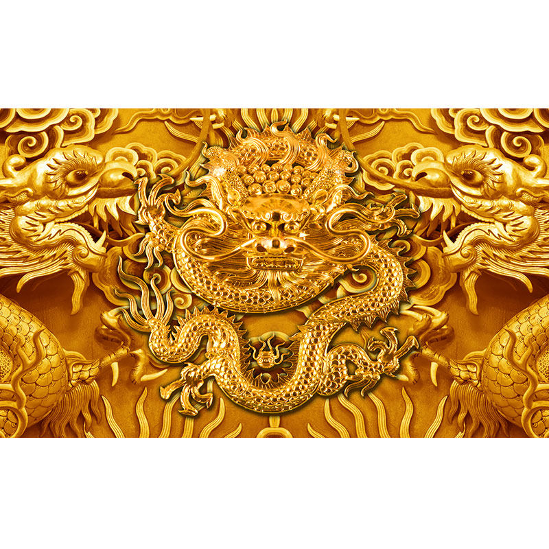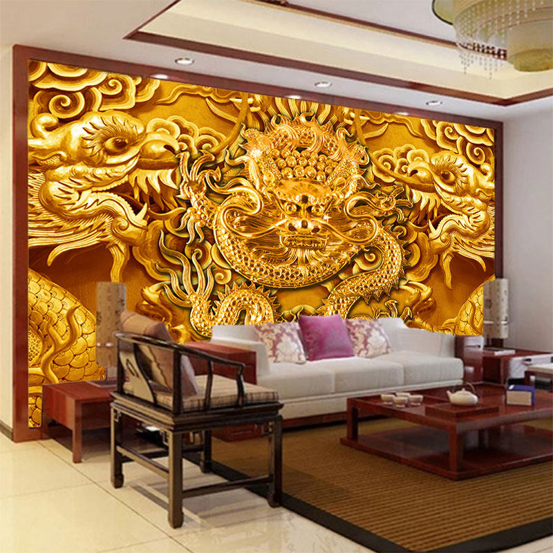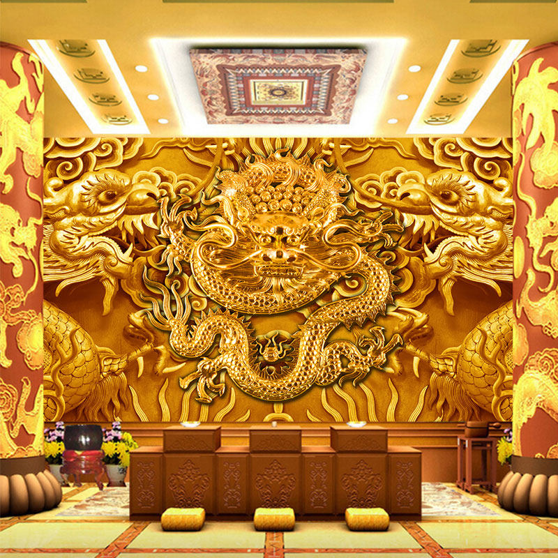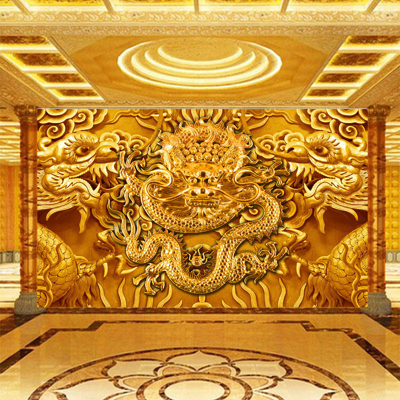 仿浮雕金龙墙纸寺庙仙道佛堂背景装 饰壁画立体双龙头祥云龙纹壁纸