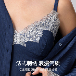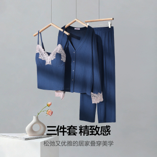 三件套装 爱慕26春睡美人睡衣女抗菌防螨凉感开衫 带胸垫吊衣九分裤
