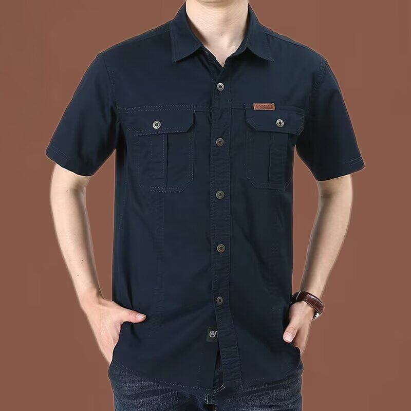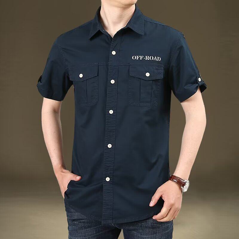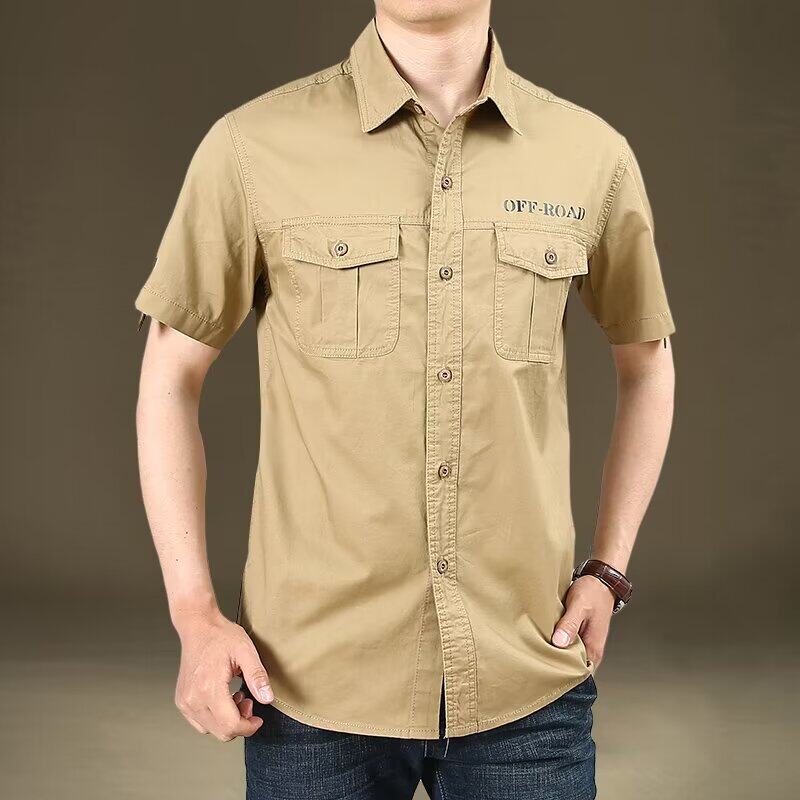 修身 全棉工装 男夏季 短袖 纯棉军绿色有口袋双兜军旅风休闲衬衣 衬衫