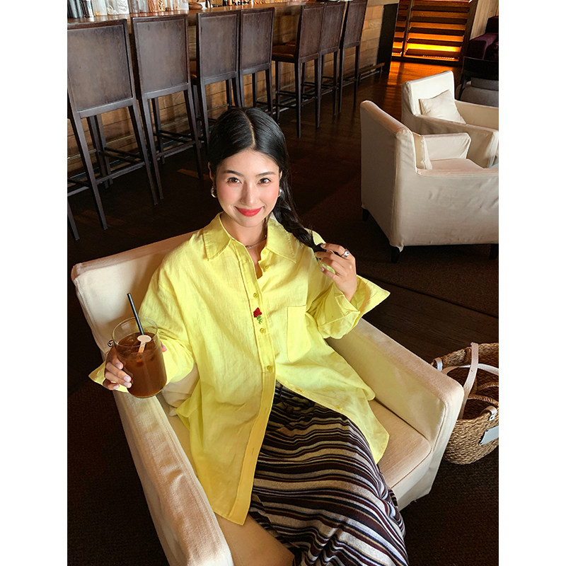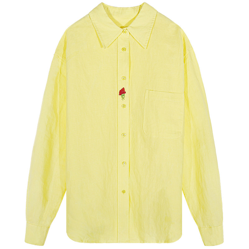 女棉麻长袖 黄色宽松衬衫 上衣 开春小众穿搭2025年新款 今屿花花