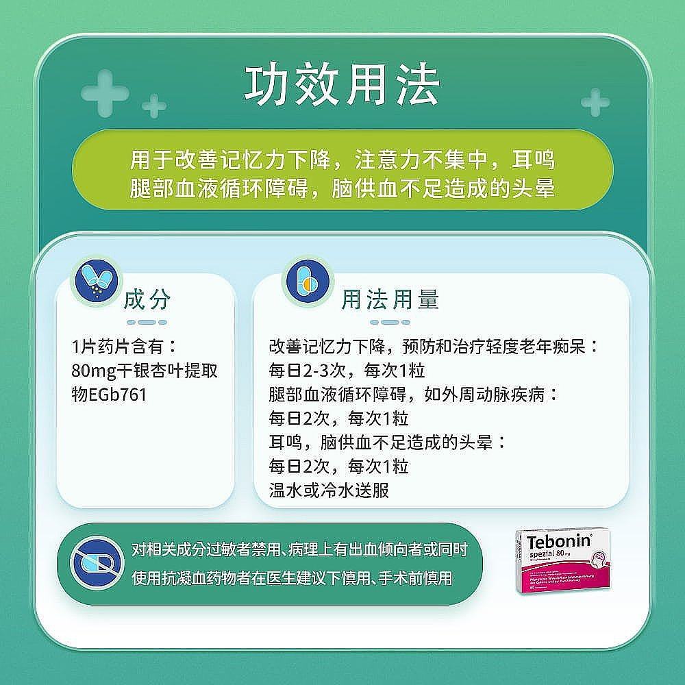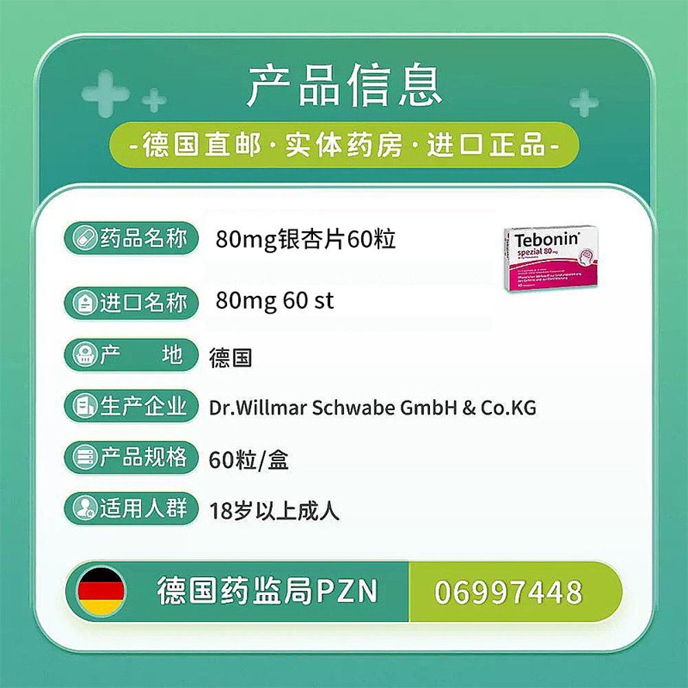 欧洲直邮德国高剂量银杏提取液80mg银杏片60粒植物护脑成分温和