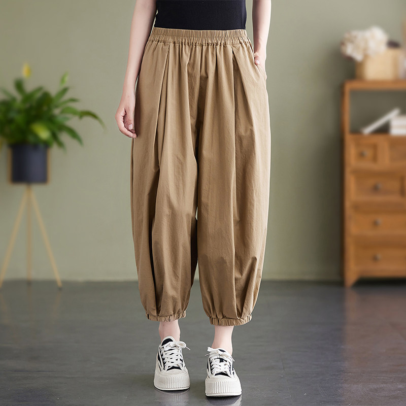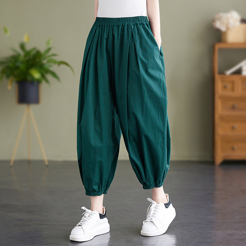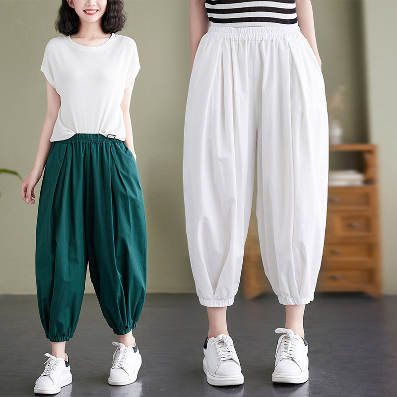 松紧腰显瘦束脚灯笼裤 夏季 宽松大码 女士百搭七分裤 纯色棉质哈伦裤