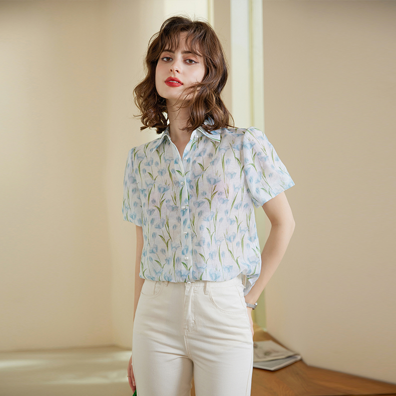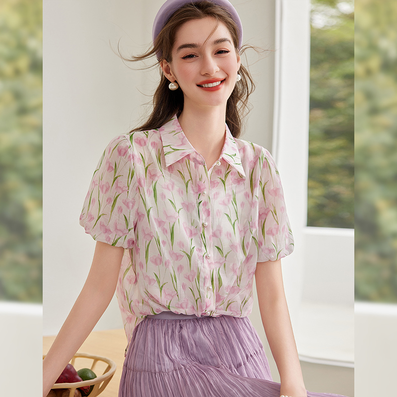 衬衫 白鹿语气质清新碎花衬衣夏季 温柔翻领泡泡袖 法式 女 款