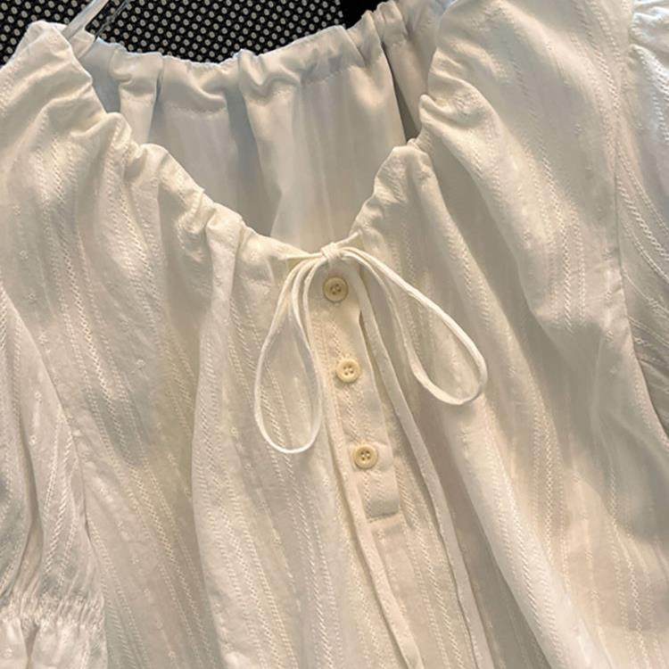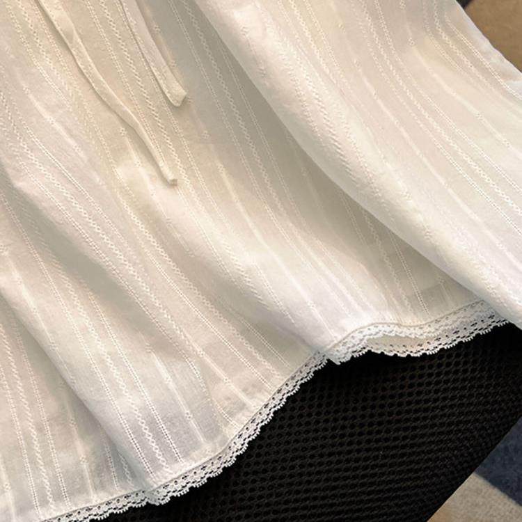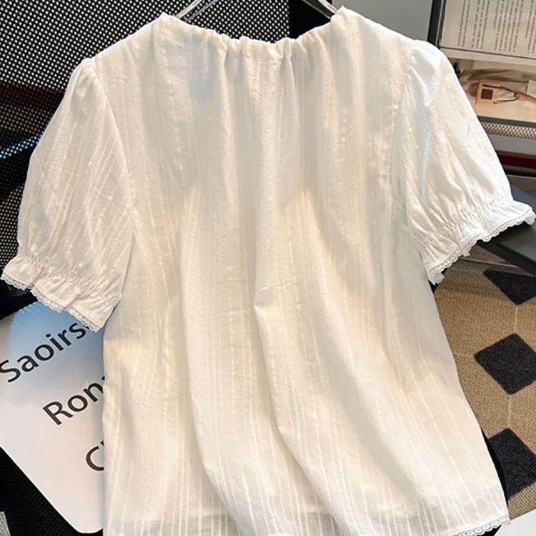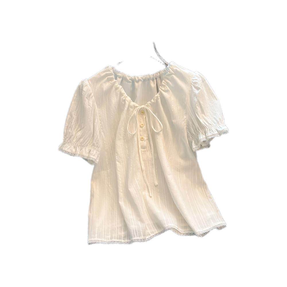 设计感短袖 薄款 上衣 女夏季 提花肌理感小花边v领绑带小衫