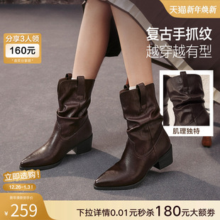 靴皮靴2025冬新款 天美意复古厚底加绒切尔西短靴女鞋 子瘦瘦靴时装