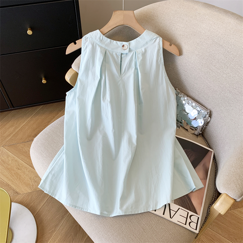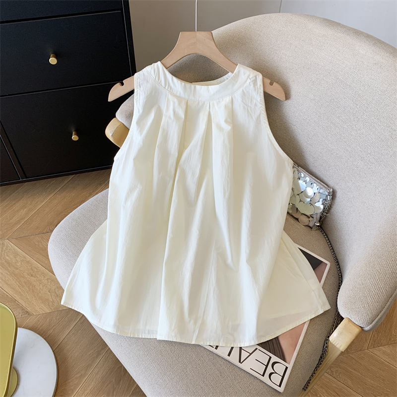 设计感压褶圆领亚麻棉麻无袖 外穿女夏季 上衣 挂脖吊带背心衬衫 法式