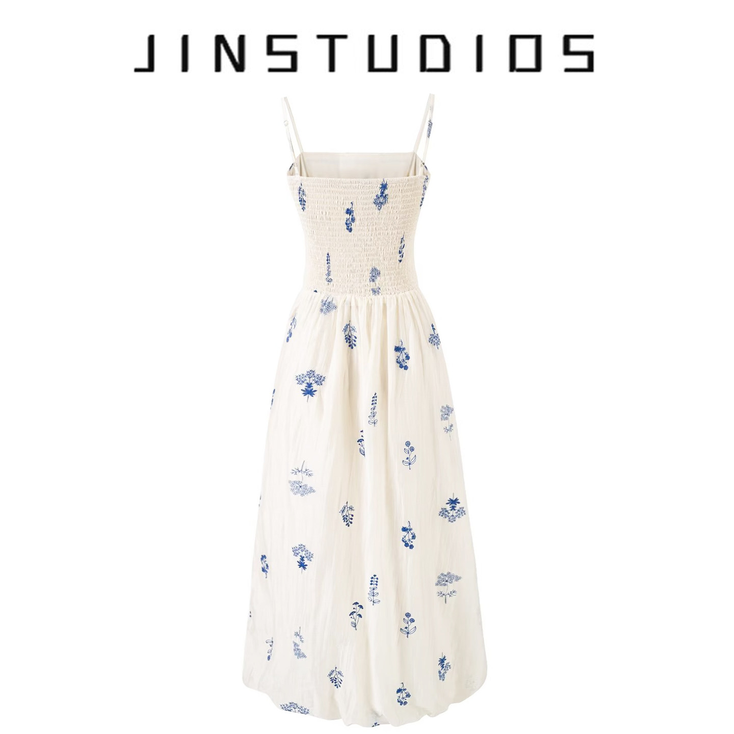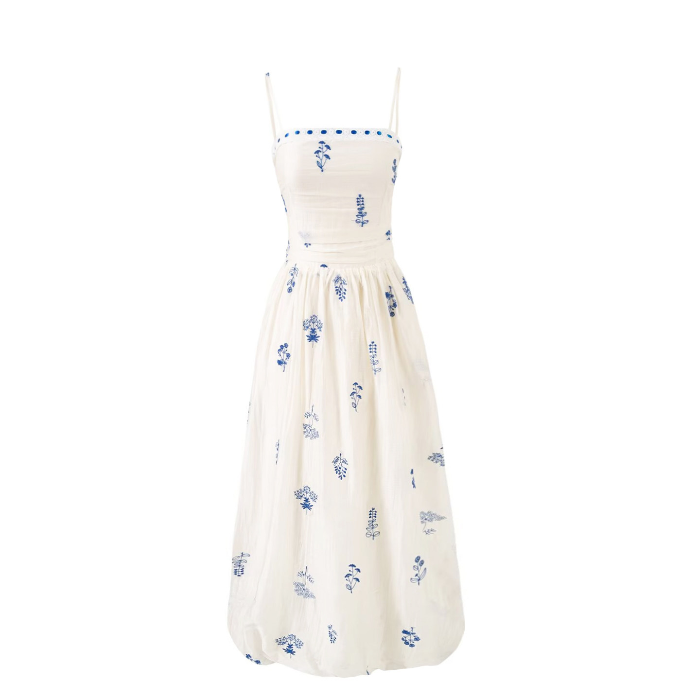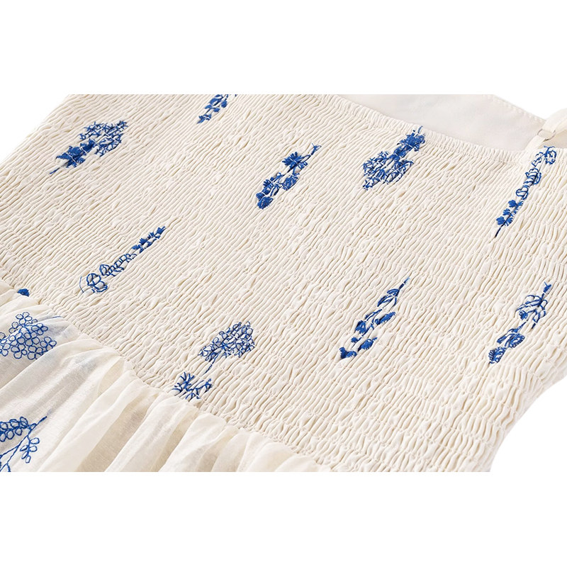 2025夏纯欲度假风花朵刺绣褶皱松紧吊带裙收腰显瘦百搭连衣裙长裙