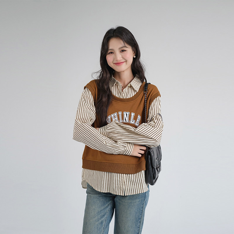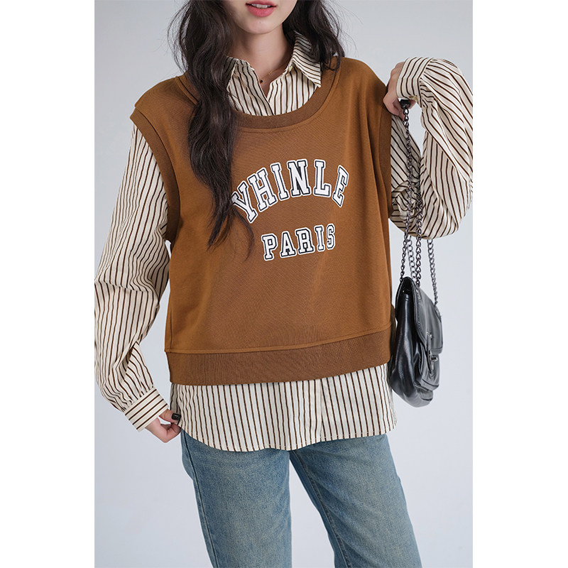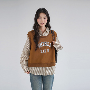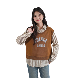 休闲宽松印花上衣200斤 假两件条纹卫衣胖MM春装 蓝若水大码 女装
