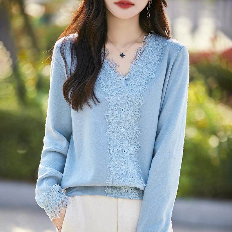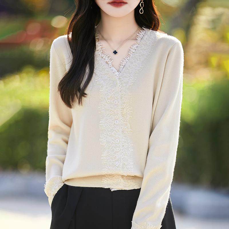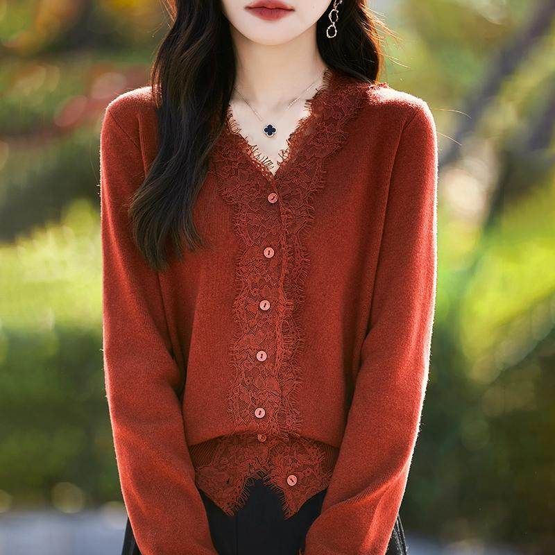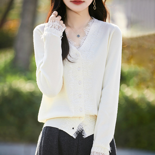 24秋冬V领精纺羊毛开衫 外套毛衣宽松外搭上衣 女蕾丝花边针织长袖