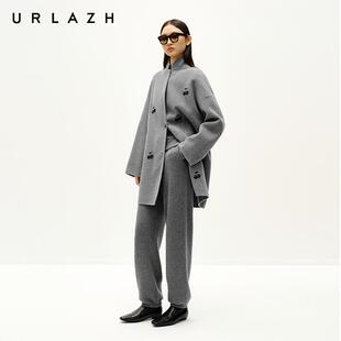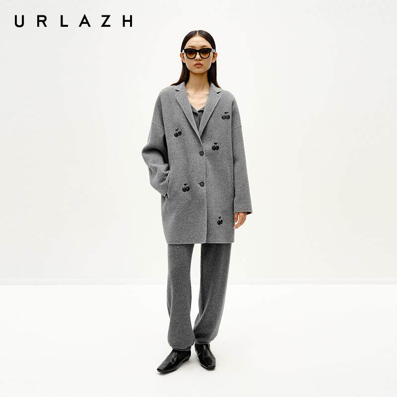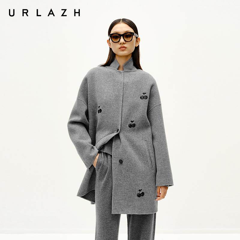URLAZH有兰冬季 冰川灰樱桃绣花宽松纯羊毛呢外套呢子大衣女 新款
