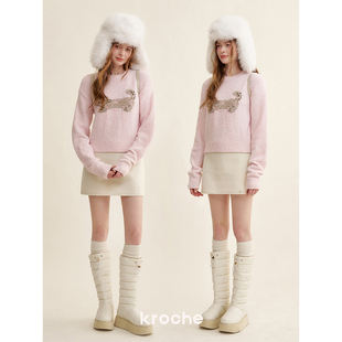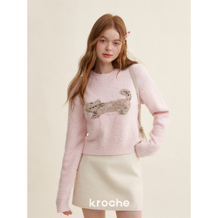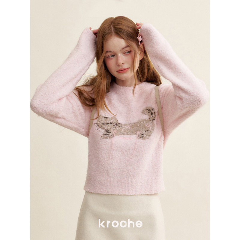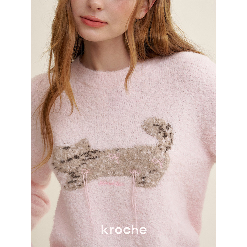 猫咪提花圆领针织衫 羊毛混纺 粉色毛衣 趣味动物 Kroche