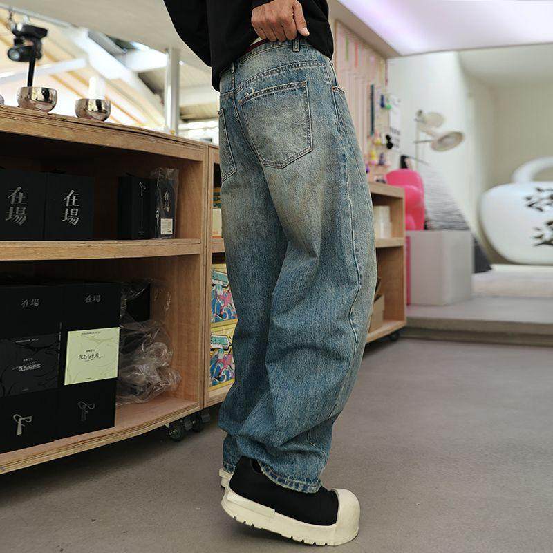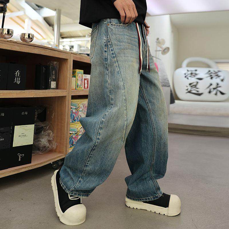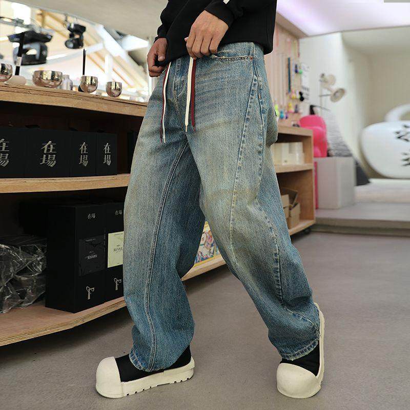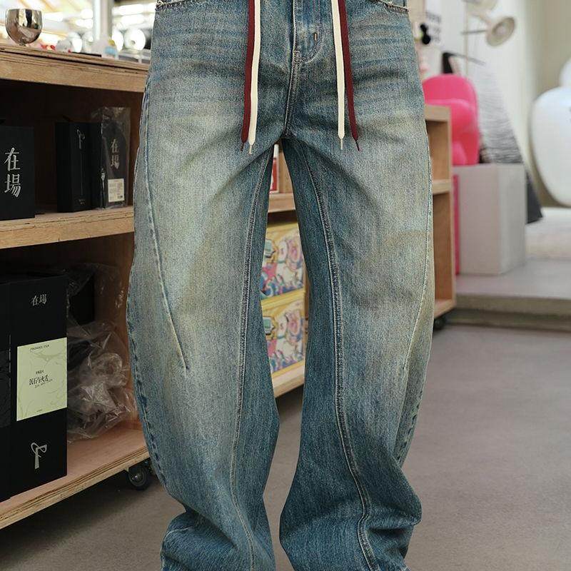 腰部抽绳极简多口袋牛仔裤 巴黎风日系街头复古蓝百搭款 休闲长裤