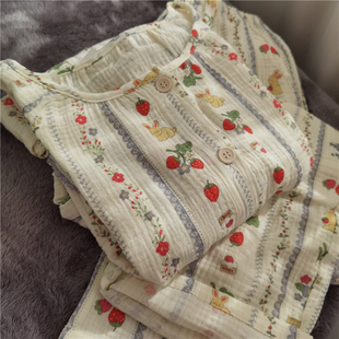 翻领圆领开衫 女纯棉双层纱布水洗棉纱蓝条兔子睡衣家居服长袖 长裤