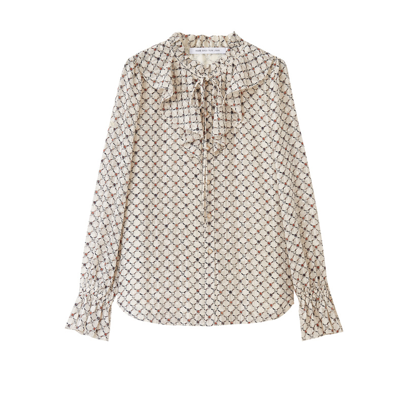 百搭气质上衣女 木耳领衬衫 仙草宝相提花缎真丝桑蚕丝白色法式 长袖
