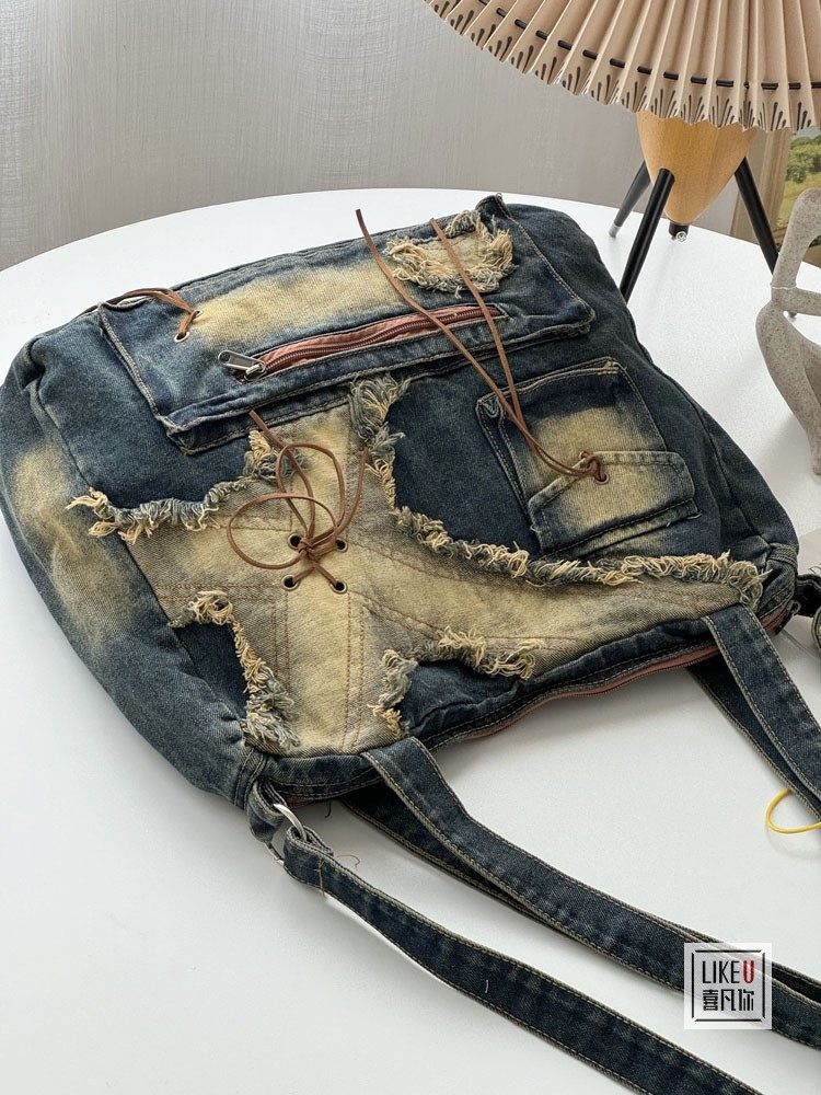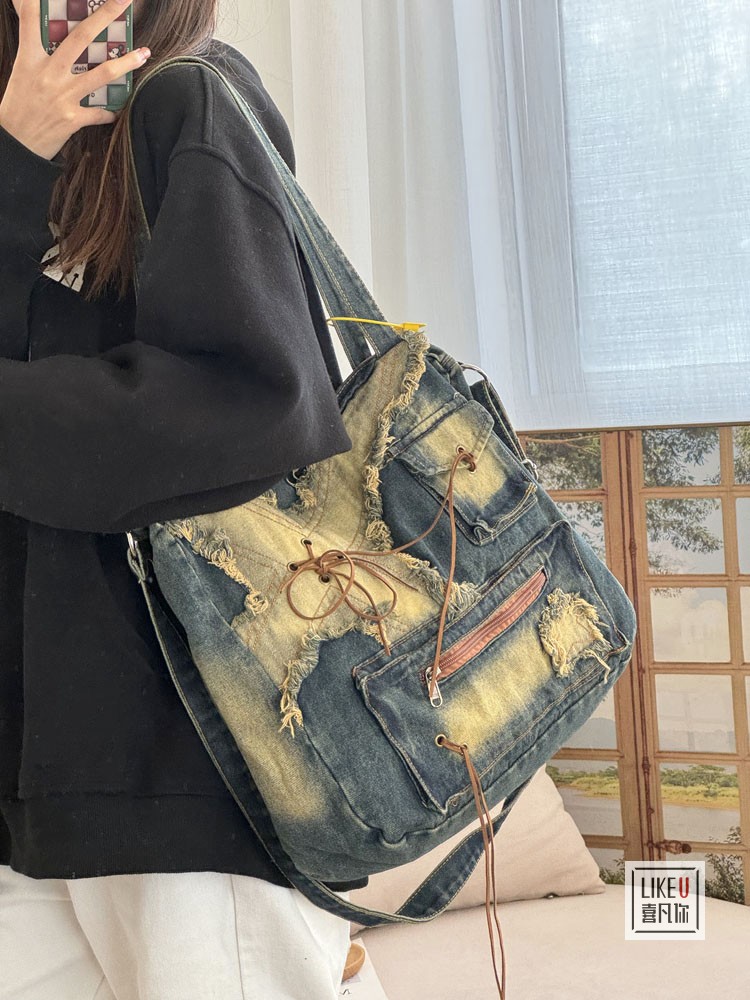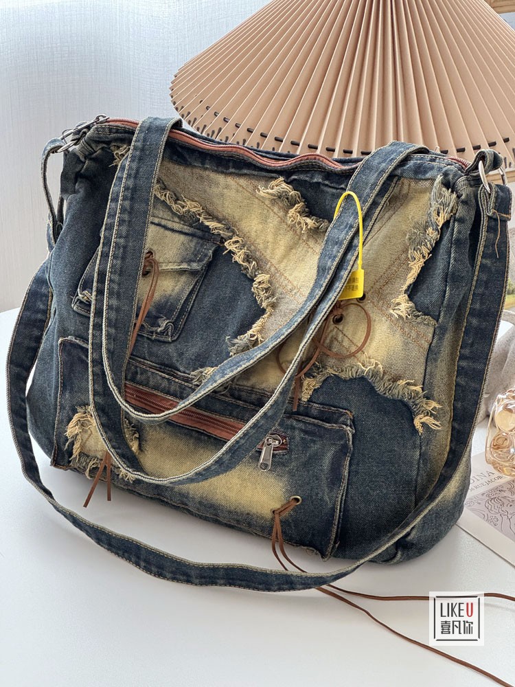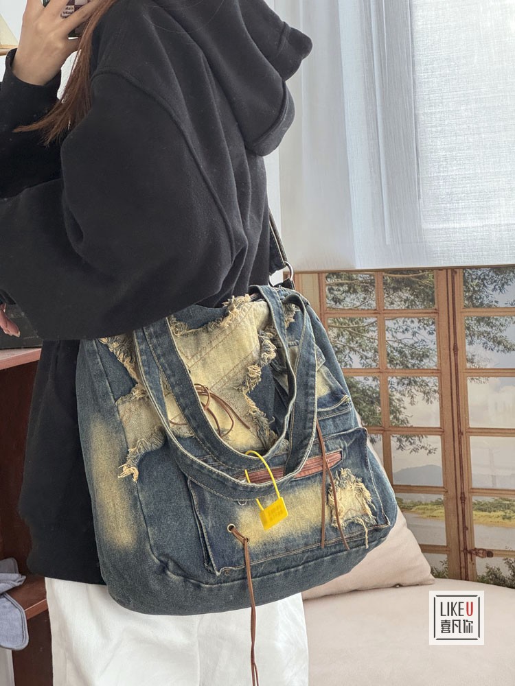 原创美式 复古做旧古着慵懒水洗牛仔包百搭学生通勤单肩斜挎托特包