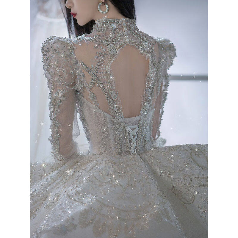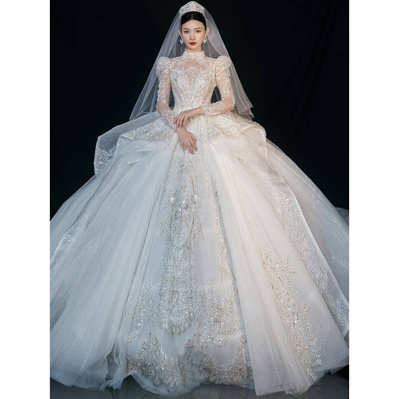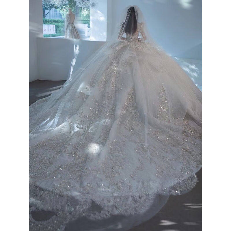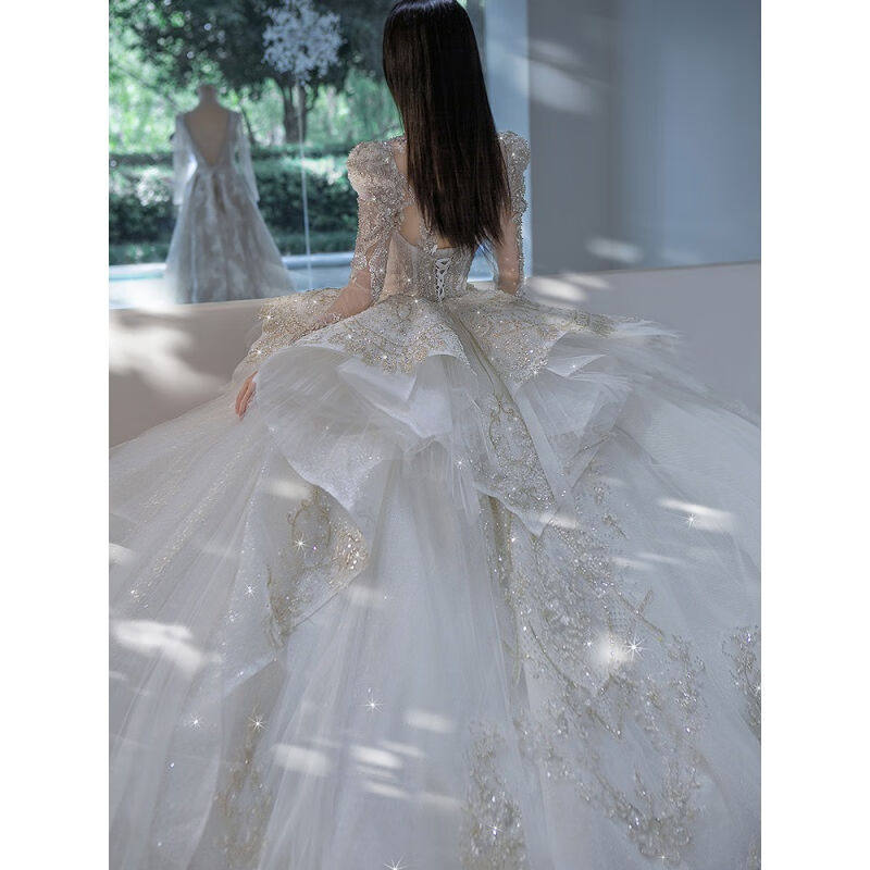 琊沫婚纱新娘主纱长袖 主婚纱2023新娘大拖尾重工小个子星空宫廷风