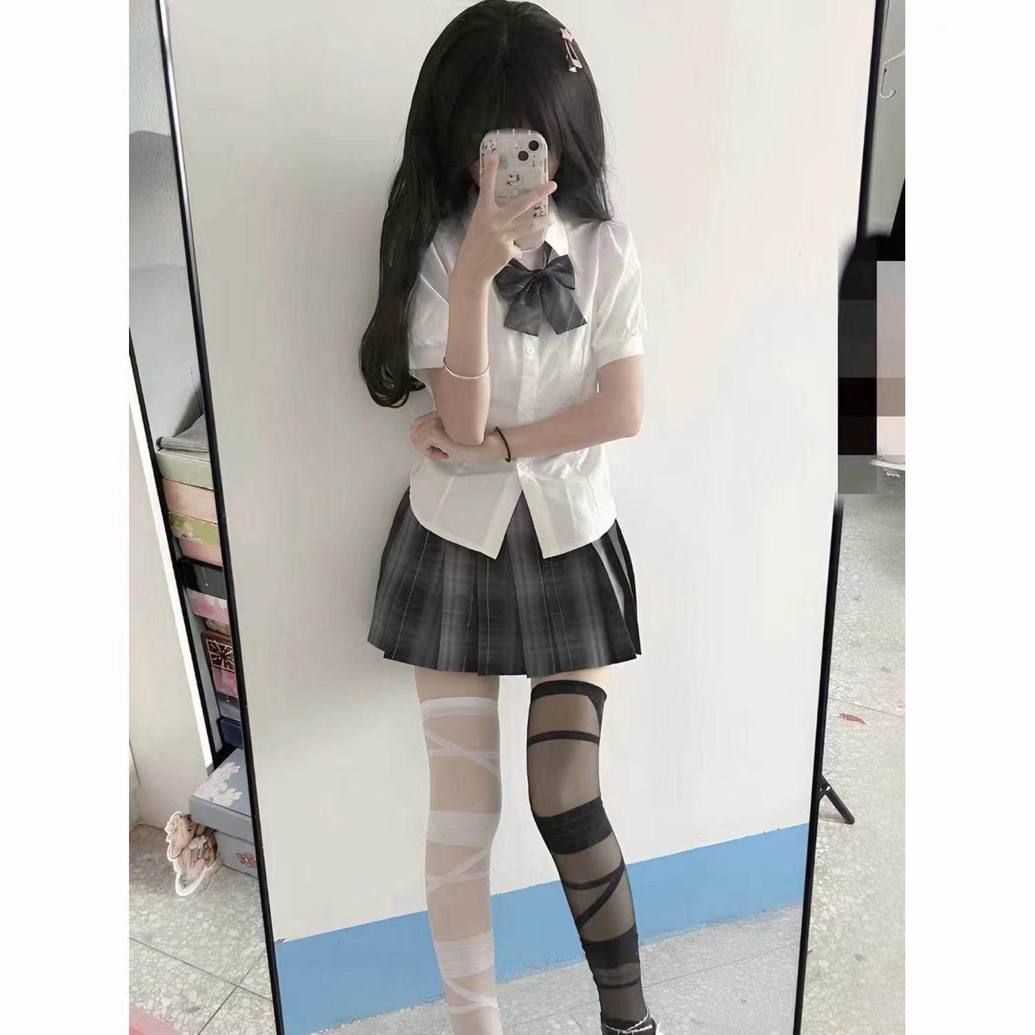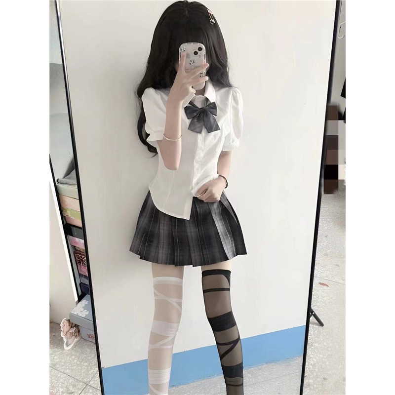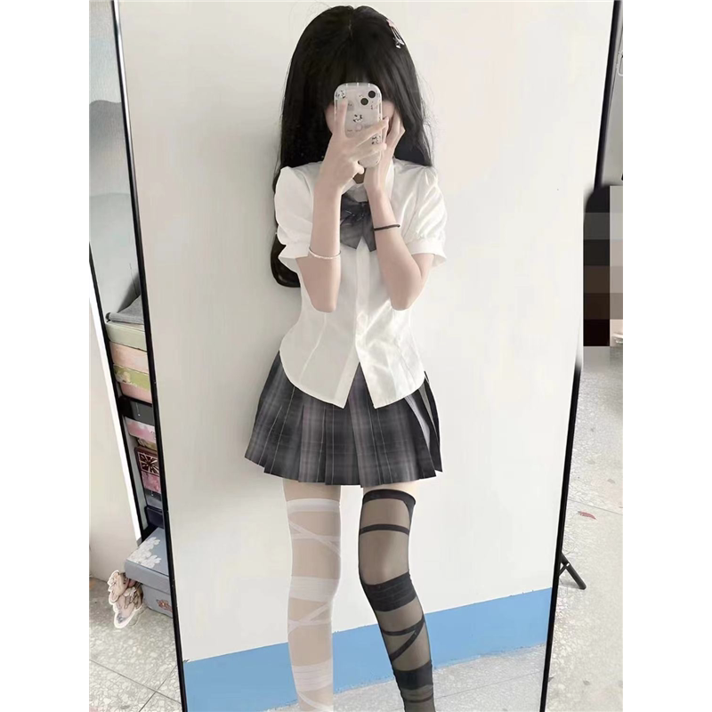 收腰衬衫 显瘦修身 短袖 纯欲风日系学院风衬衣女jk制服裙套装 泡泡袖