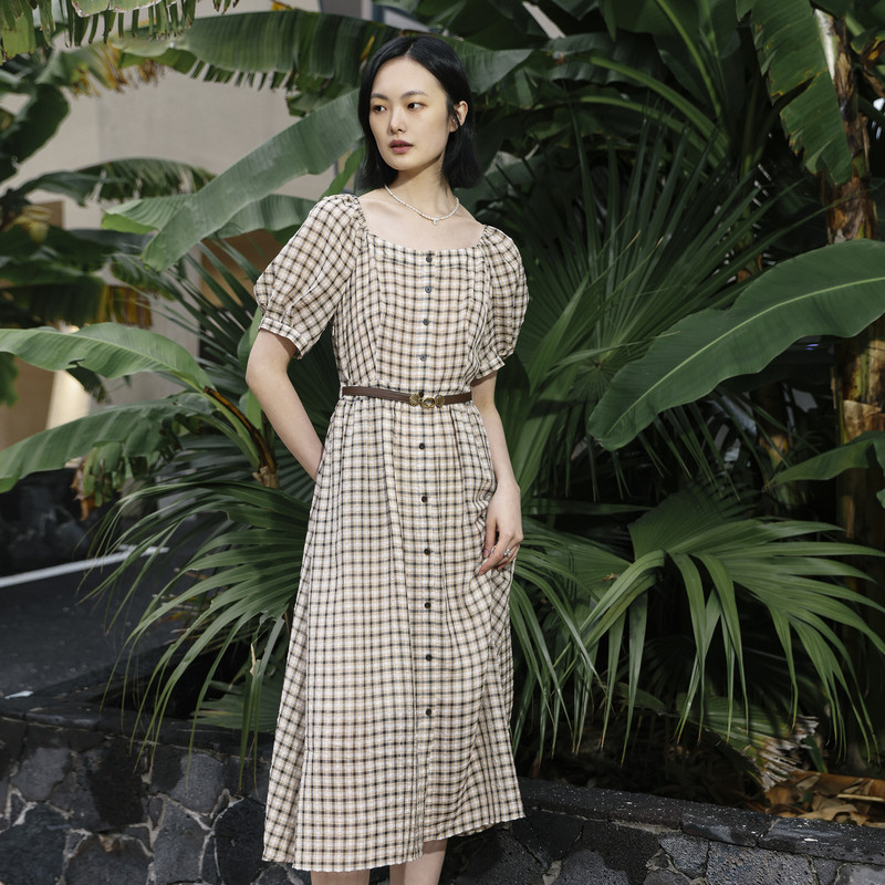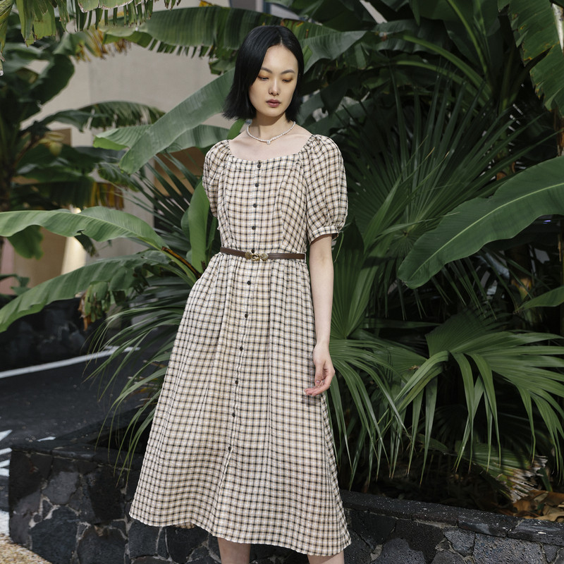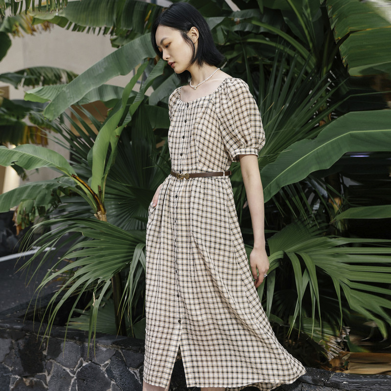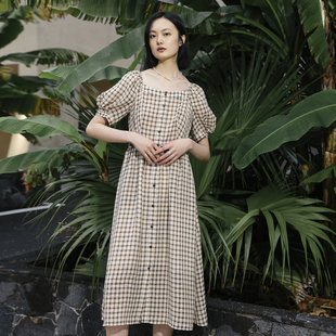 连衣裙1242N25RS2YX 米咖格纹短袖 婉甸2025夏季 新品