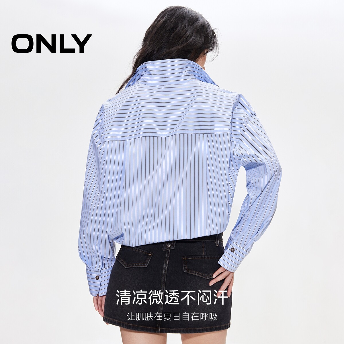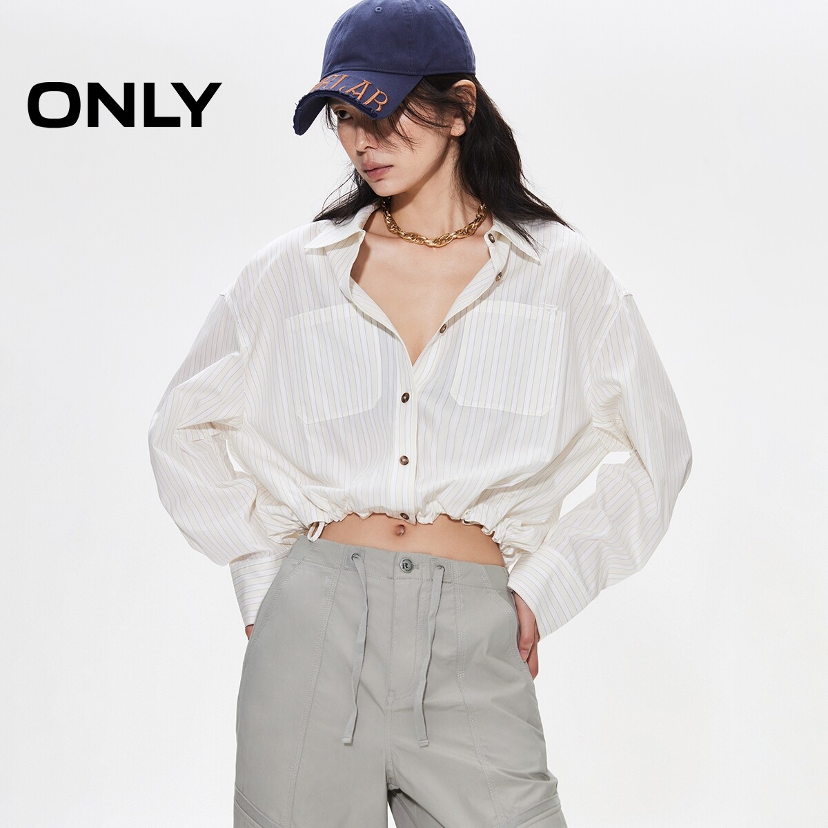 宽松衬衫 轻薄条纹抽绳下摆实用口袋落肩长袖 春款 女 ONLY奥莱