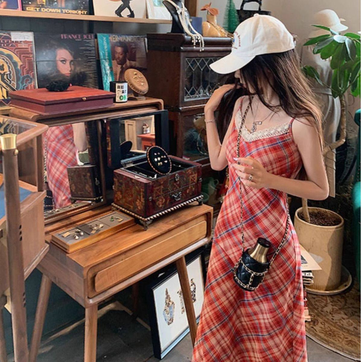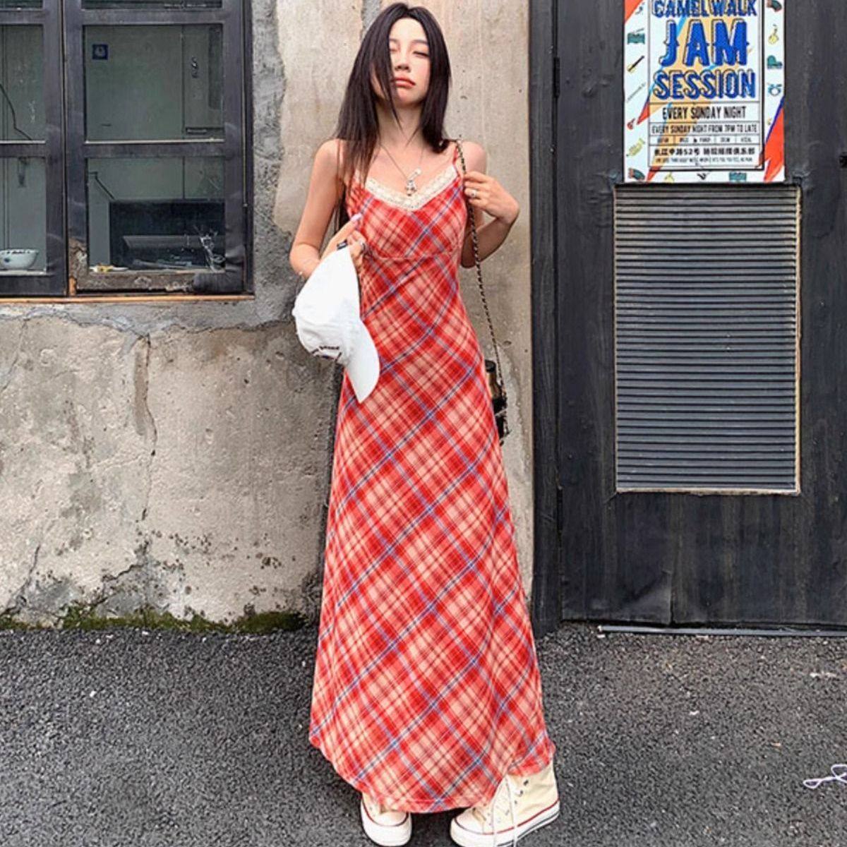 显瘦复古菱格吊带长裙 小个子修身 法式 蕾丝花边独特连衣裙女夏新款