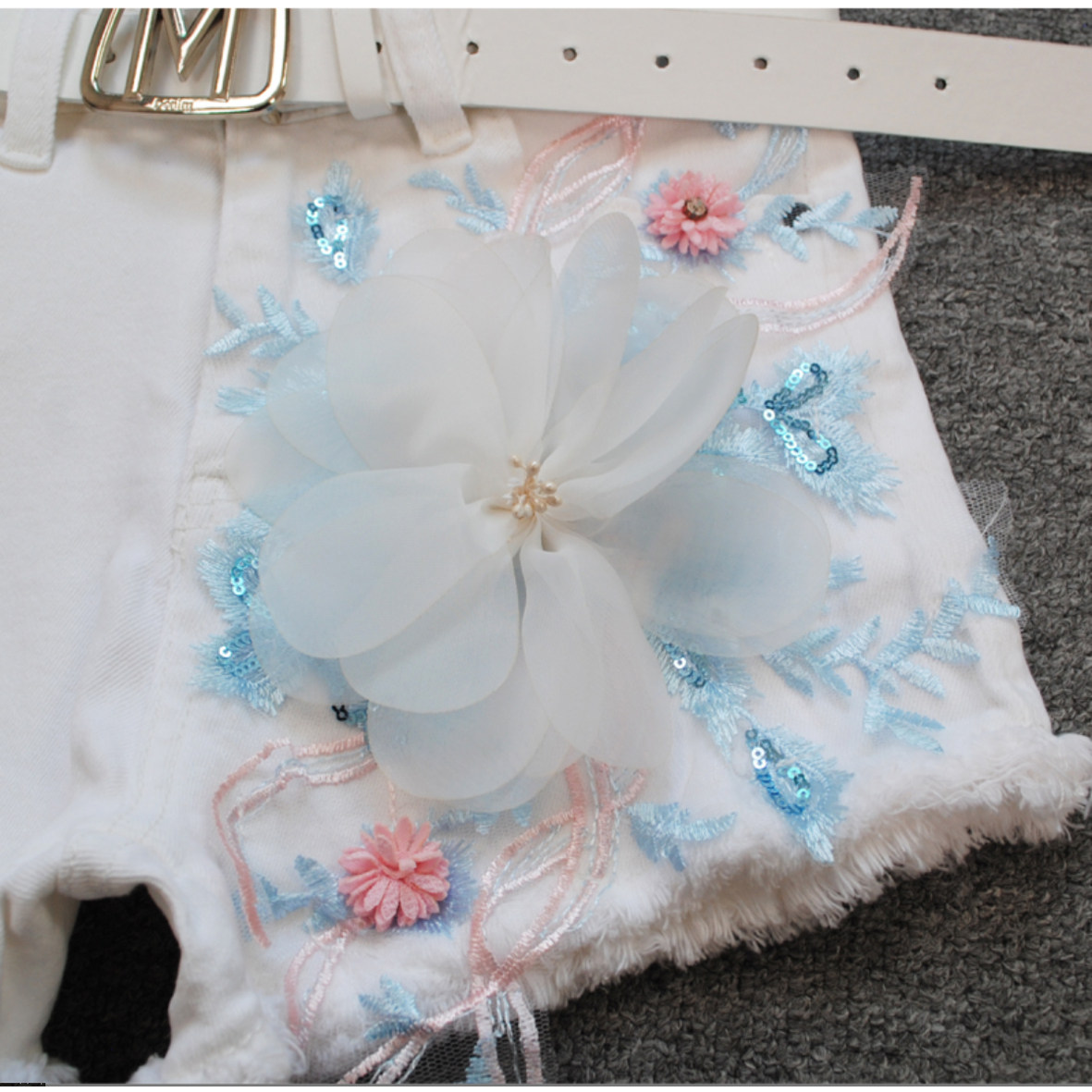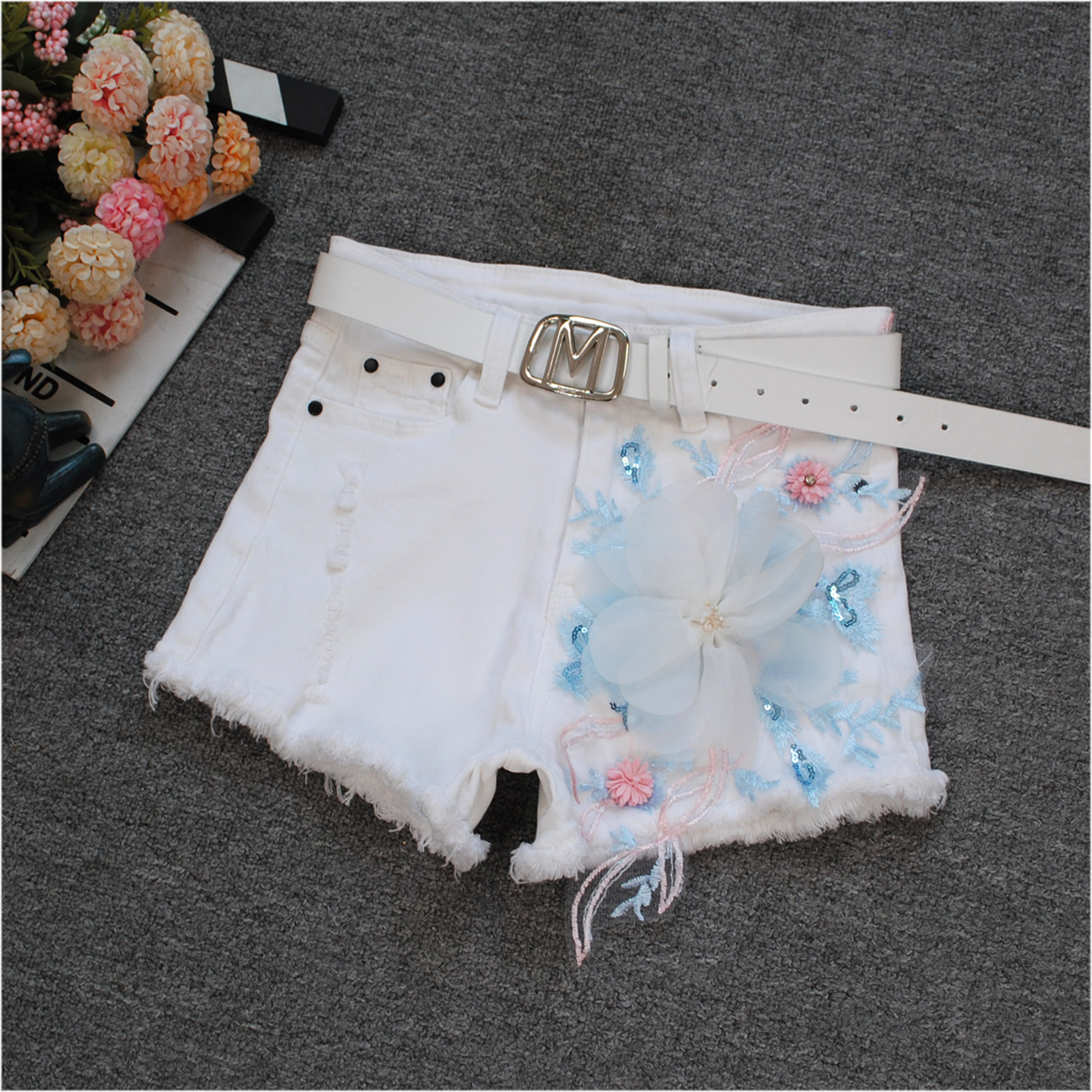 立体花朵超短热裤 白色牛仔短裤 小清新高腰弹力修身 韩版 女2026新款