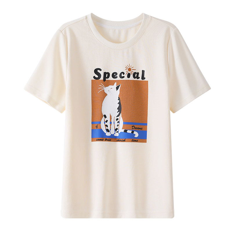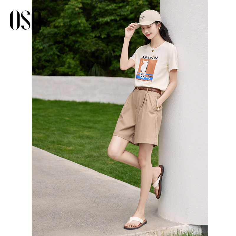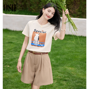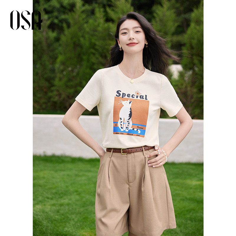 OSA欧莎趣味印花圆领休闲T恤女宽松百搭显瘦杏色上衣2025夏季 新款