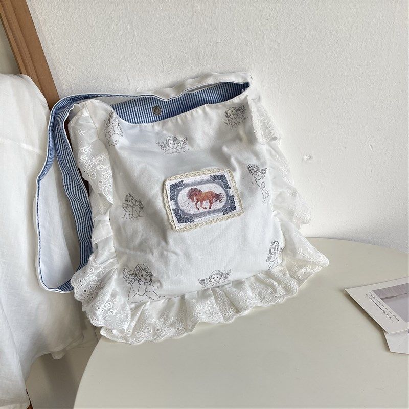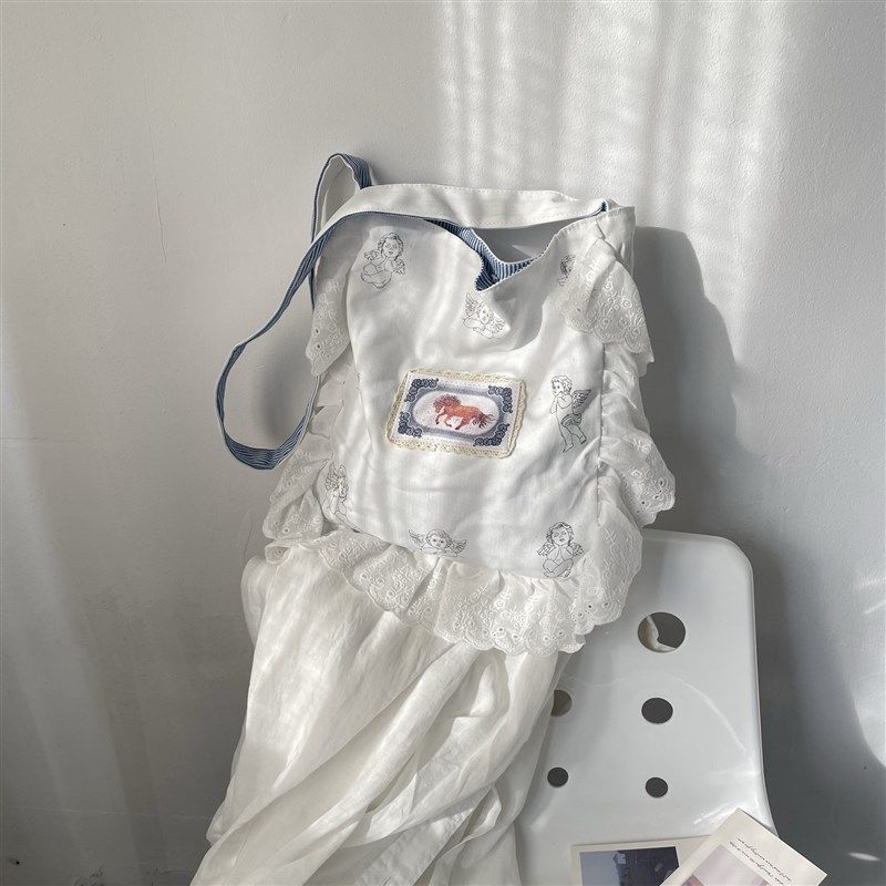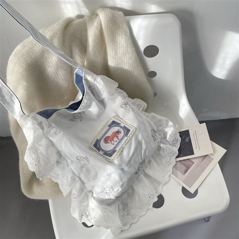 2025春夏新款 休闲百搭女包包书 森系蕾r丝花边甜美单肩帆布包时尚