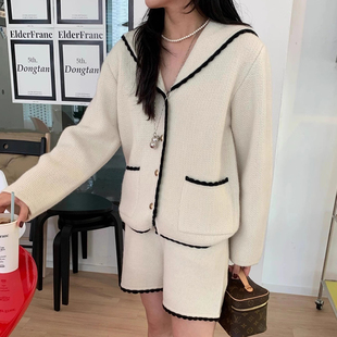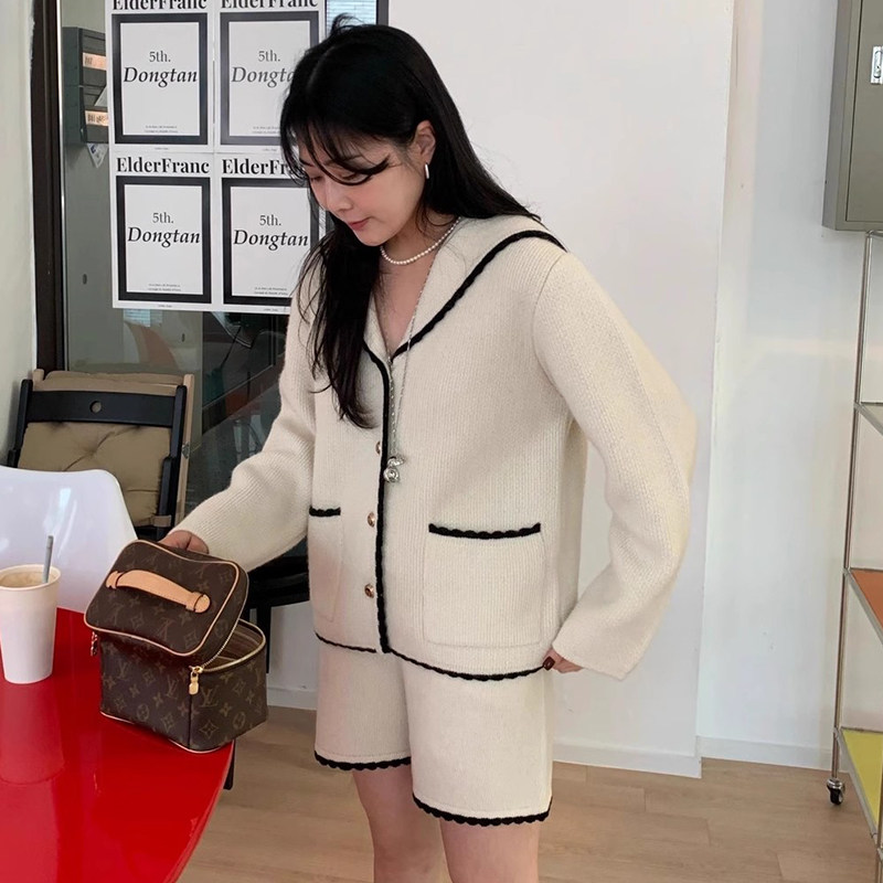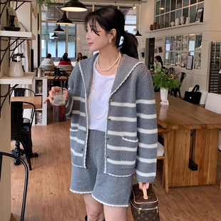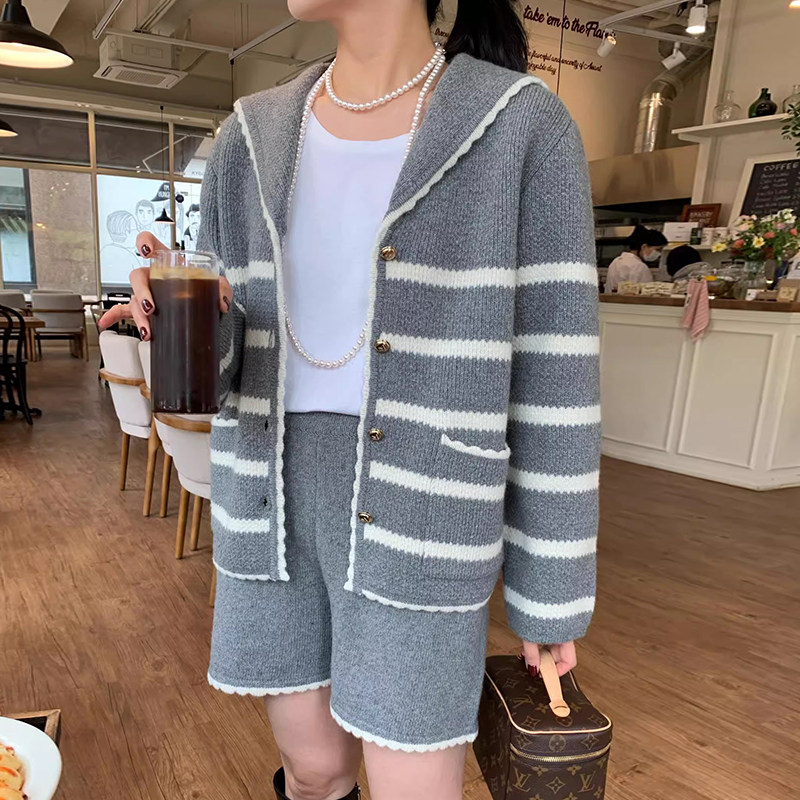 套装 花边休闲短裤 复古减龄海军领条纹针织毛衣外套 韩国chic秋季