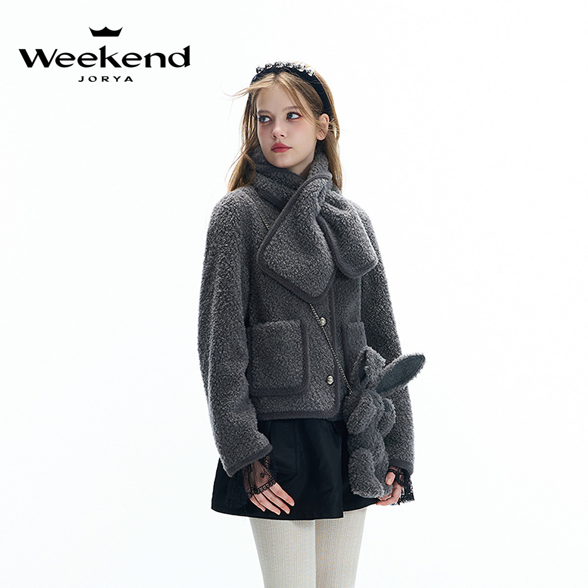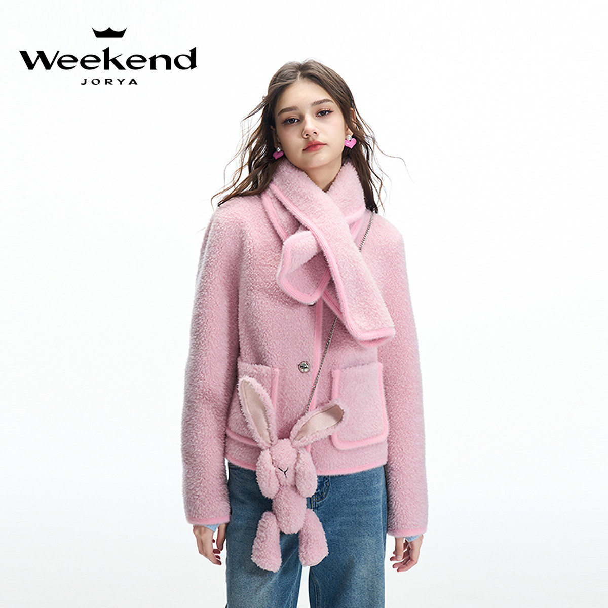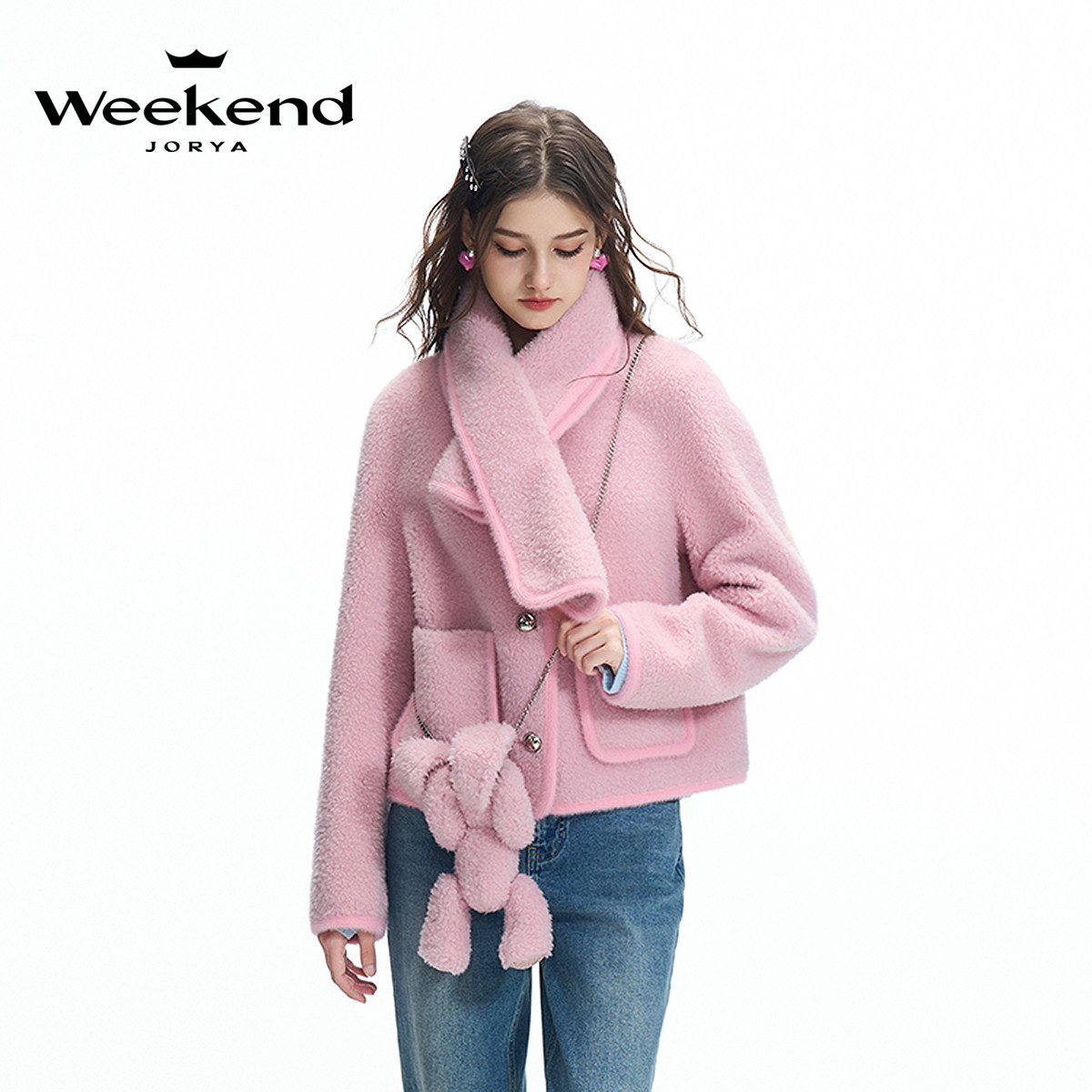 卓雅周末2024冬季 圆领口袋单排扣围脖羊羔毛皮草外套Q260207C 新款