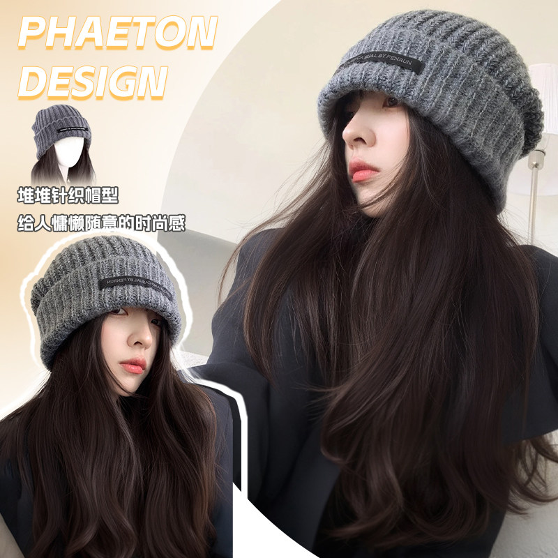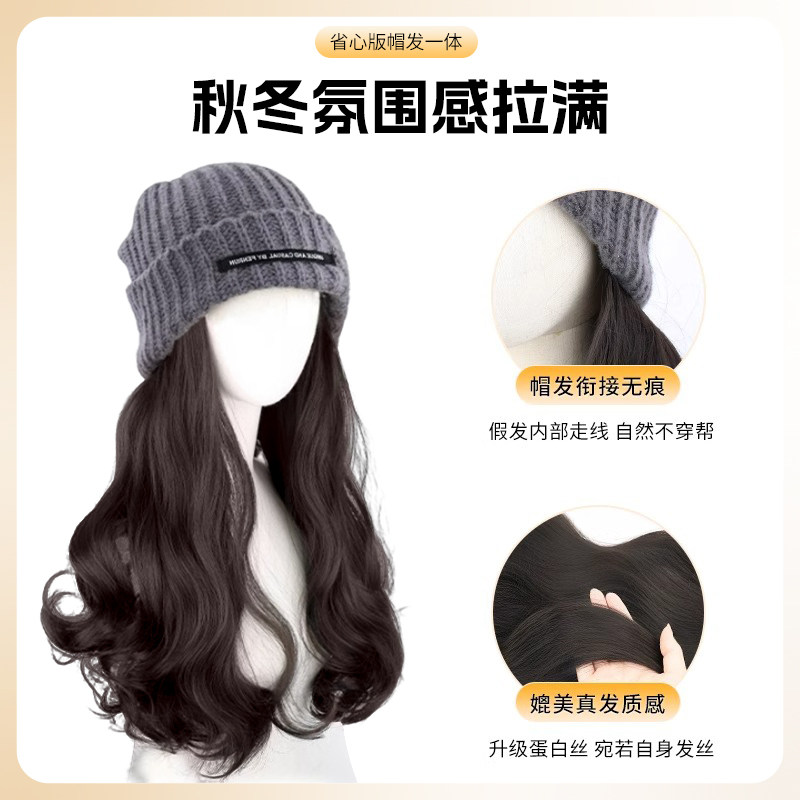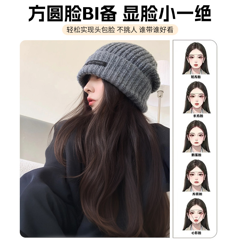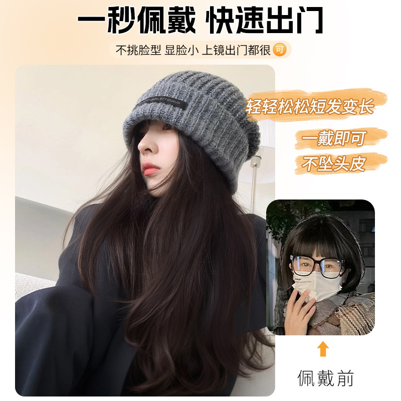 假发帽子女秋冬2025新款 韩系氛围感针织帽长卷发一体可拆卸全头套