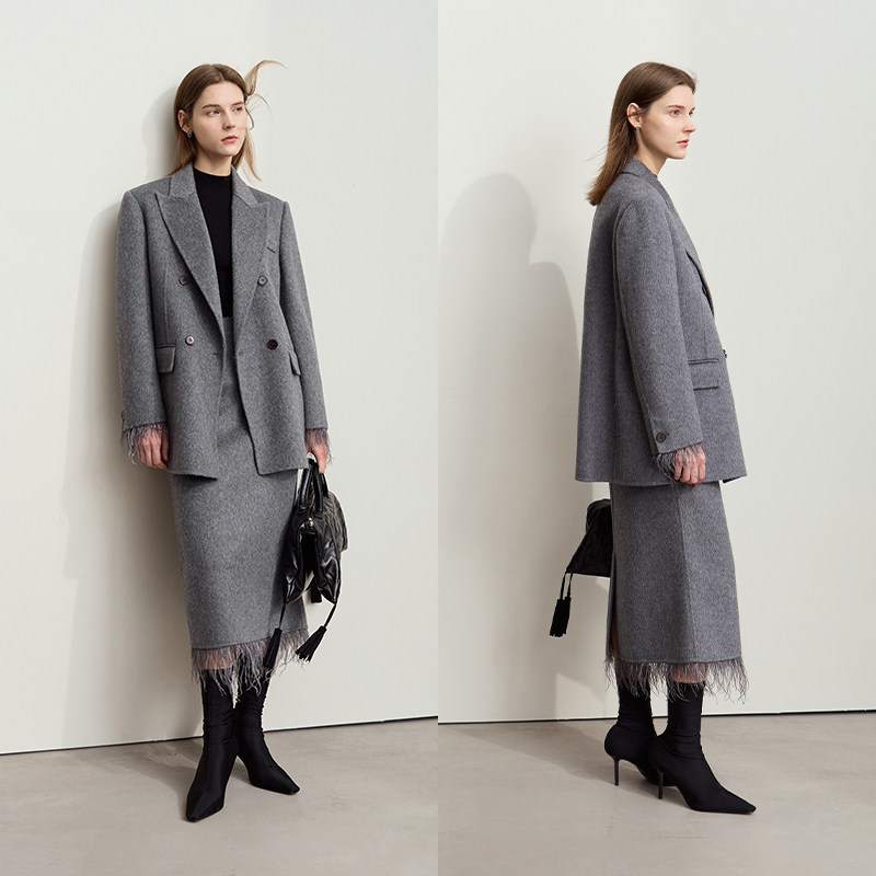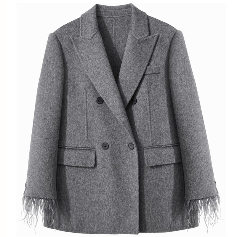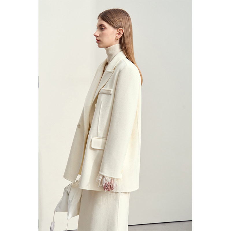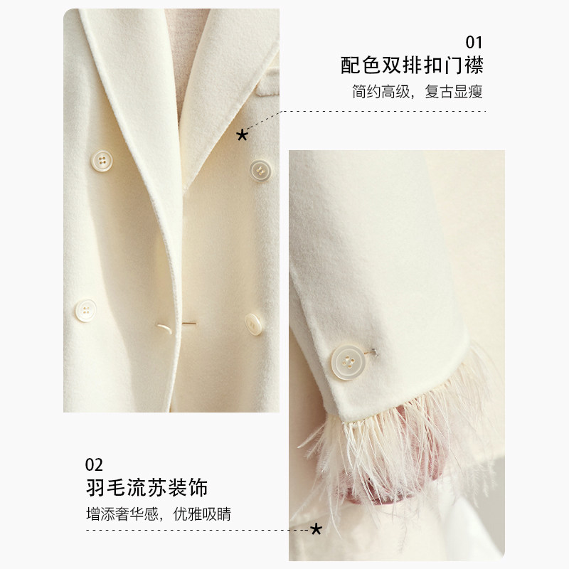 羽毛流苏装 领中长款 饰呢大衣 西装 Amii复古全羊毛双面呢外套女冬季