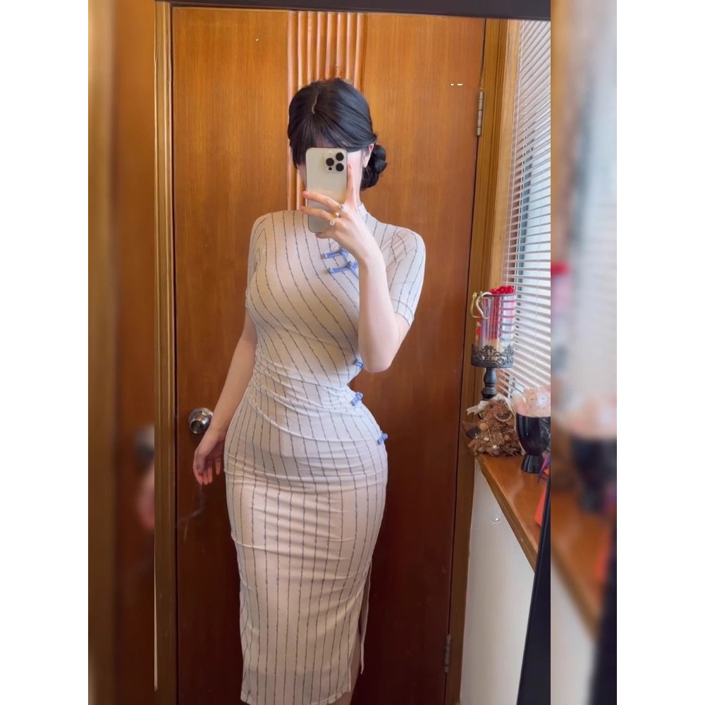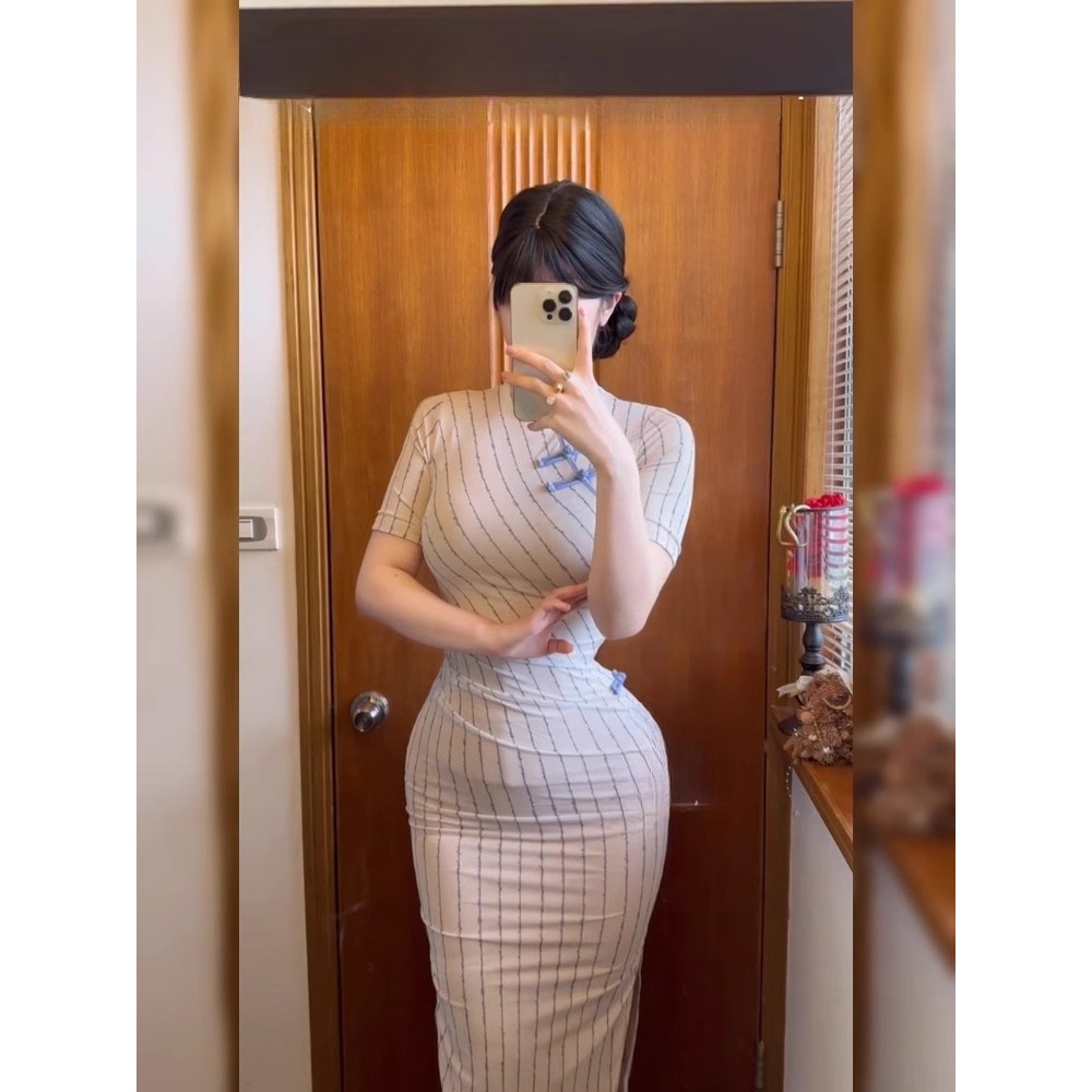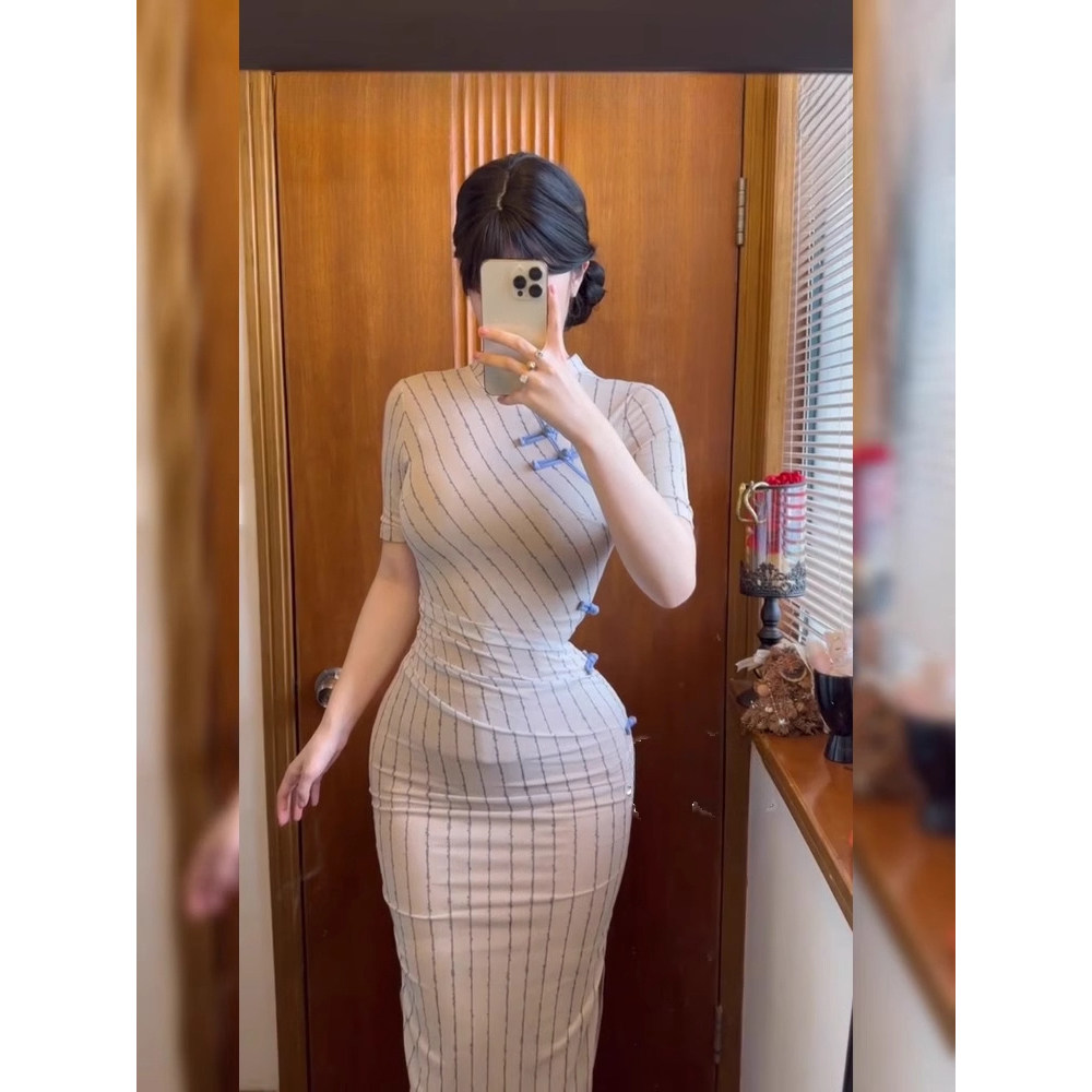 微胖小个子新中式 气质收腰显瘦包臀裙 国风条纹改良旗袍连衣裙新款