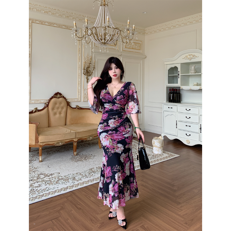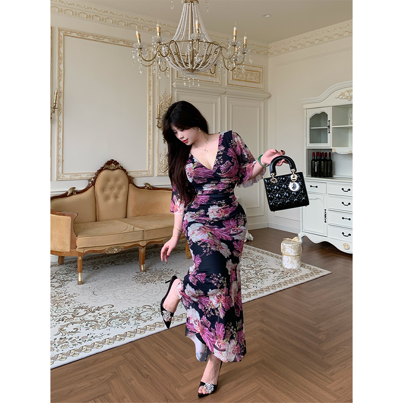 复古V领修身 微胖法式 网纱收腰包臀碎花连衣裙 与花共舞 Bbabes