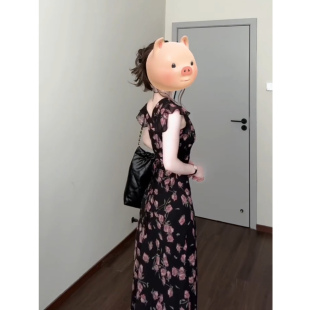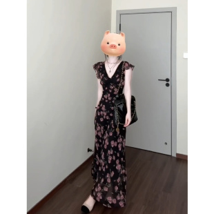 长裙 复古玫瑰印花V领连衣裙女25年夏收腰显瘦小飞袖 XZY 微胖法式