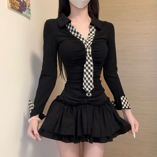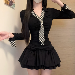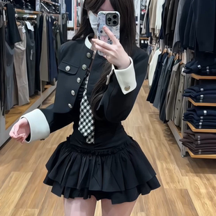 高腰半身a字短裙套装 iqcq气球熊辣妹显瘦翻领纯欲风长袖 上衣春季