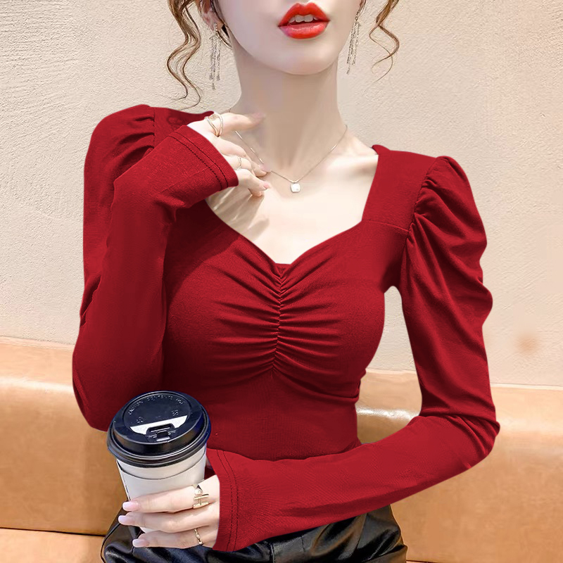 春秋新款 打底衫 独特辣妹性感T恤黑色长袖 绝美别致方领上衣女法式