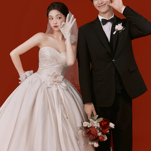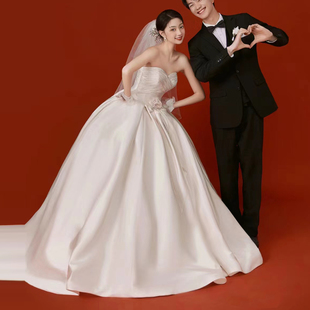 法式 简约抹胸花朵公主蓬蓬裙新娘出门纱齐地超仙 缎面婚纱2025新款