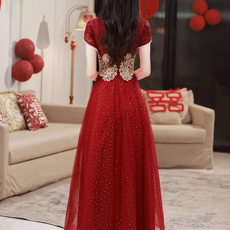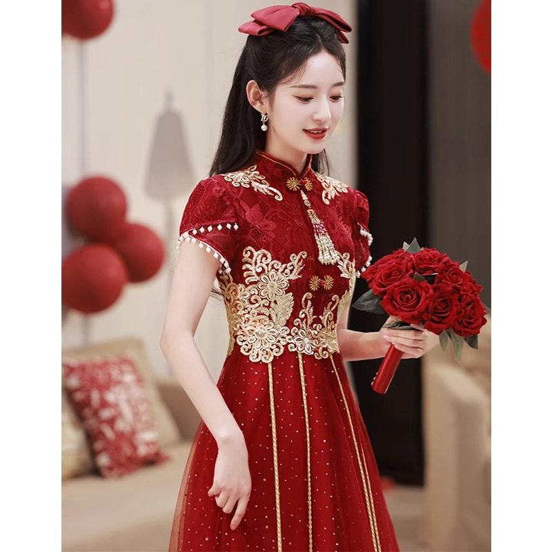 旗袍敬酒服新娘2025新款 酒红色订婚礼服裙小个子回门服 高级感中式