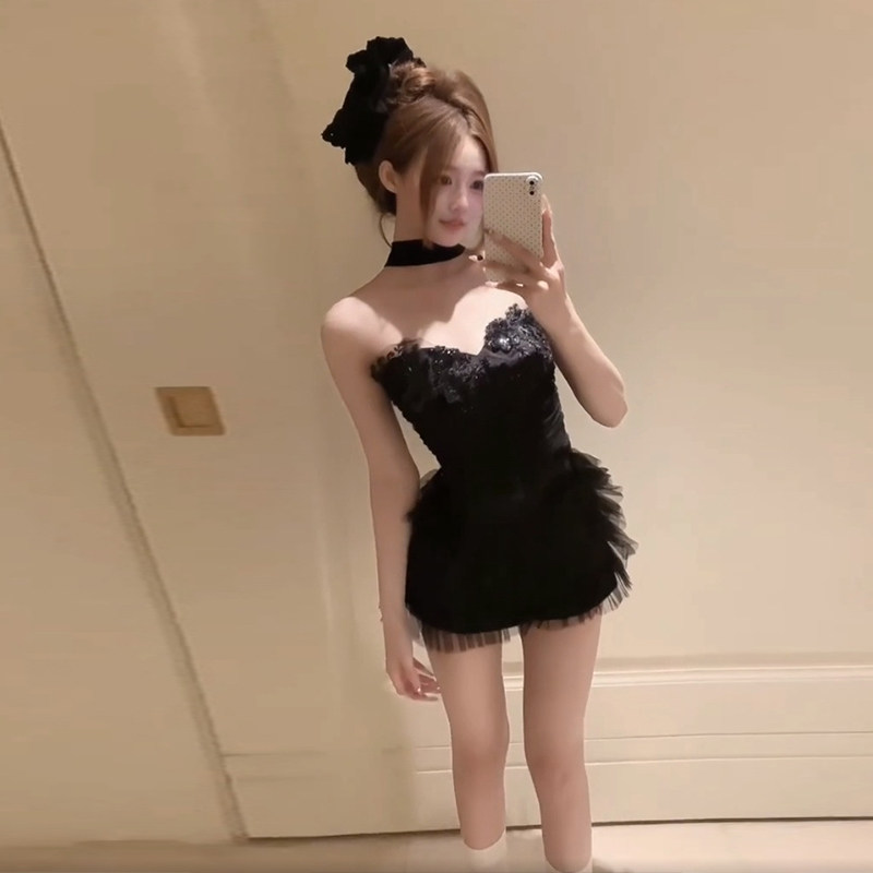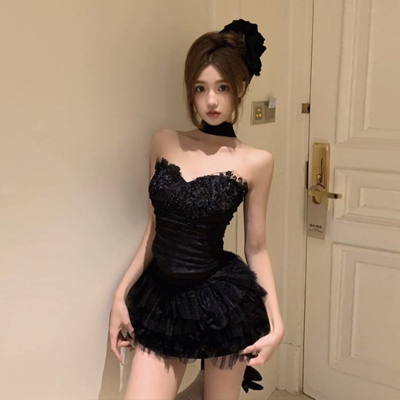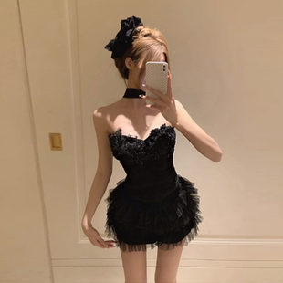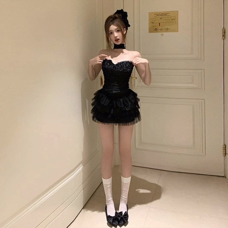 御姐性感辣妹套装 夏 赫本风黑色一字肩抹胸上衣蓬蓬短裙两件套裙装