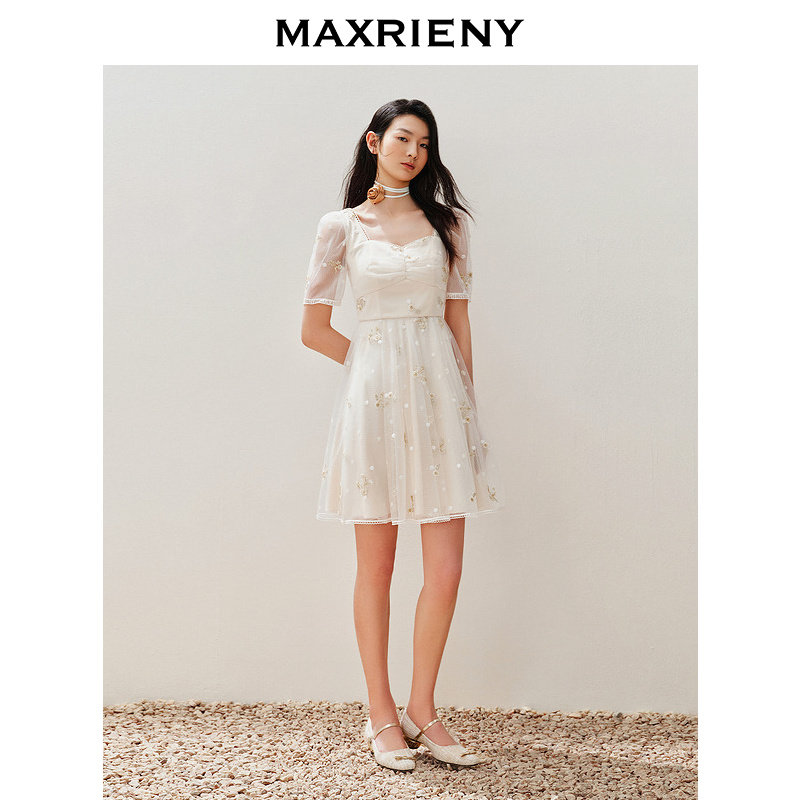 MAXRIENY华丽复古网纱连衣裙约会领证裙子小白裙 奥莱