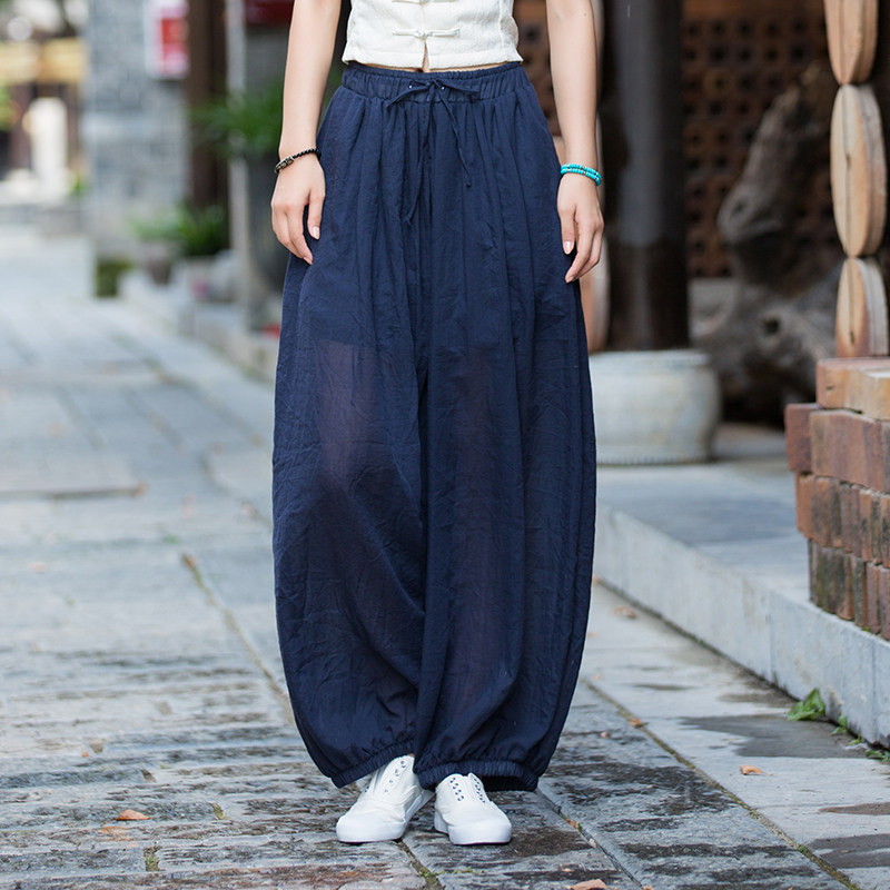 薄款 松紧腰系绳亚麻休闲裤 夏季 麻纱轻盈灯笼裤 新款 棉麻禅意打坐裤