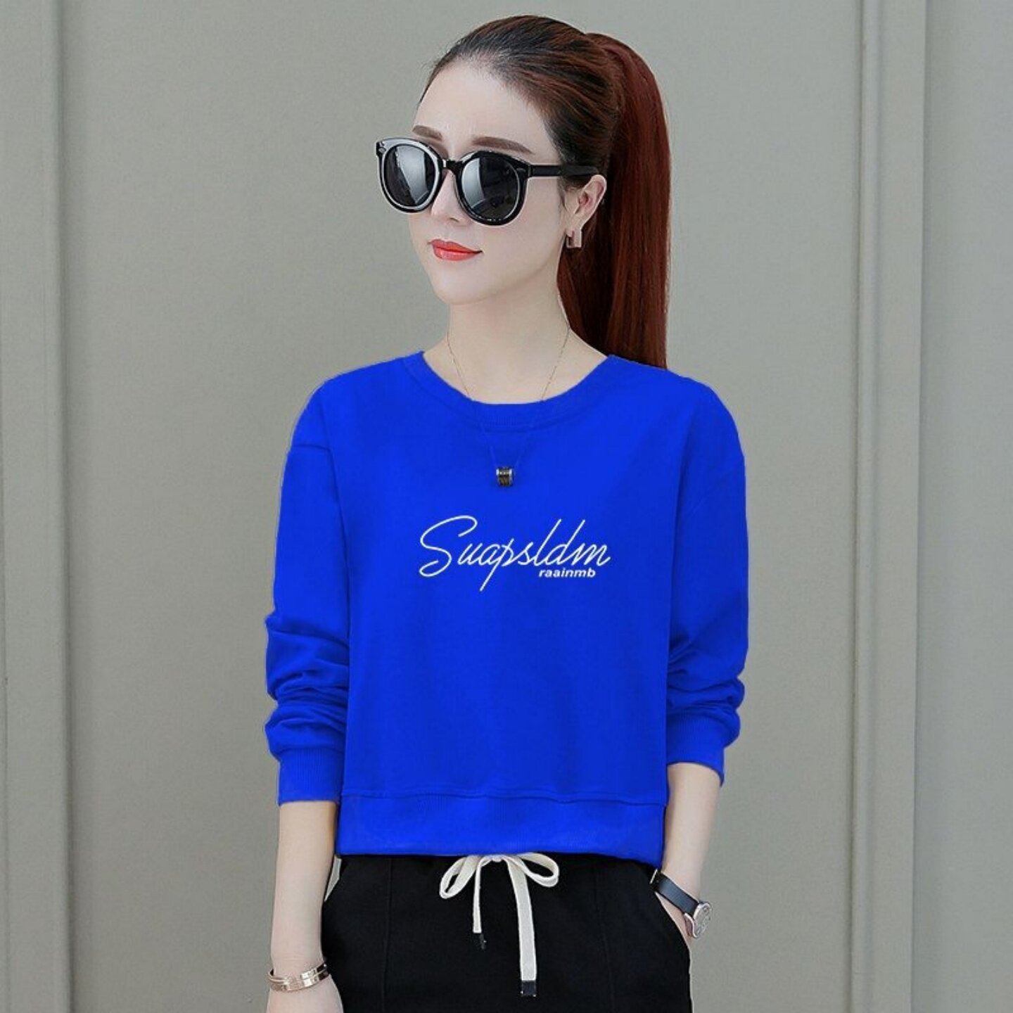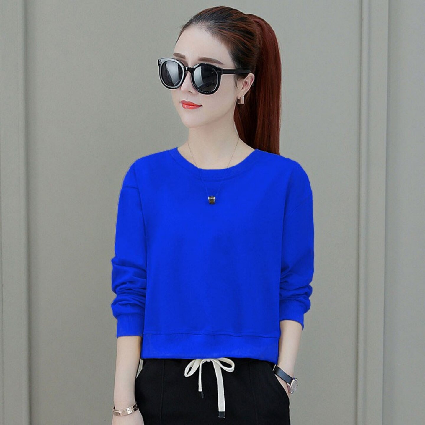 秋季 蓝色卫衣女显瘦小个子洋气女装 新款 高腰短款 外套 宽松韩版 长袖