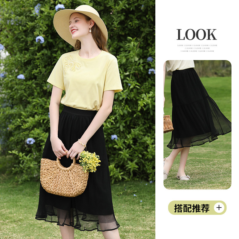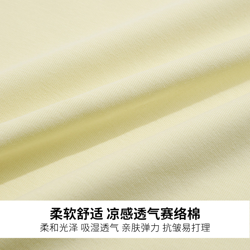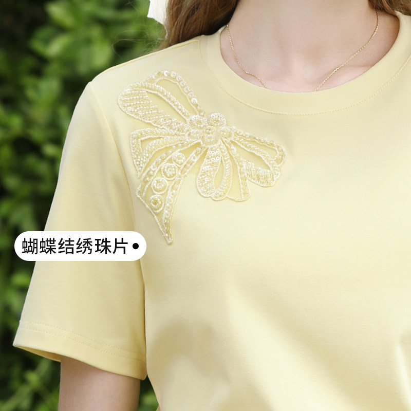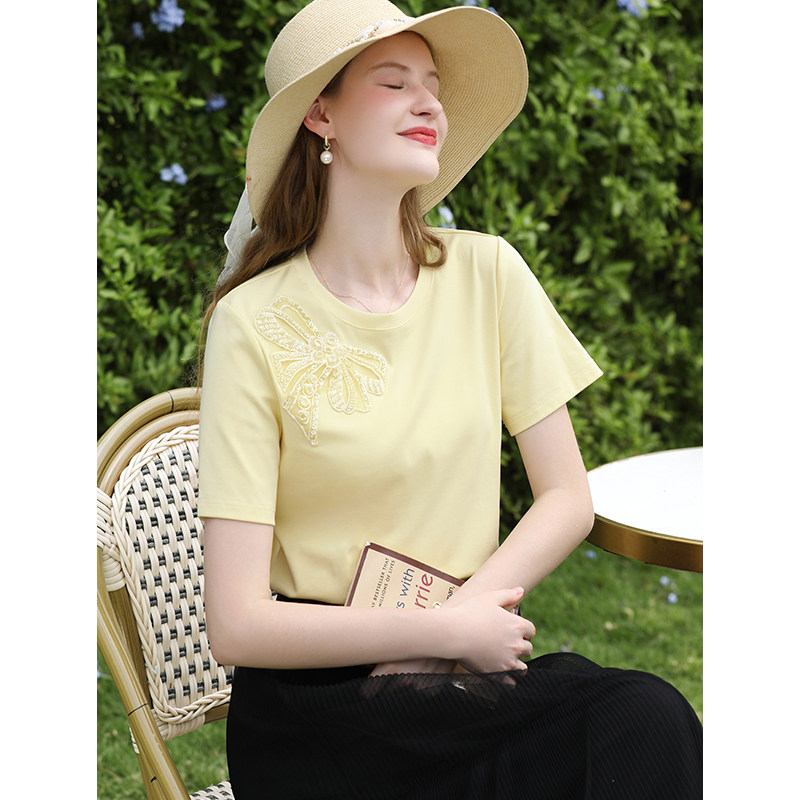 T恤上衣女2026夏季 艾蓓怡黄色蝴蝶结珠片绣花短袖 新款 凉感棉