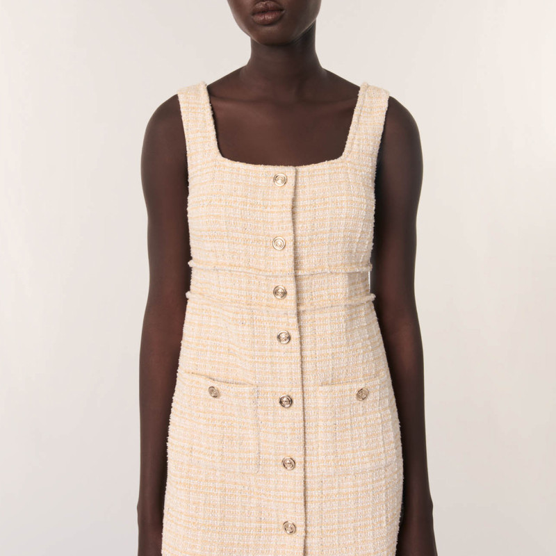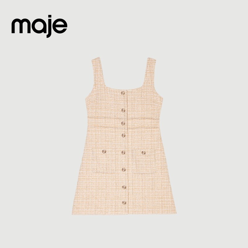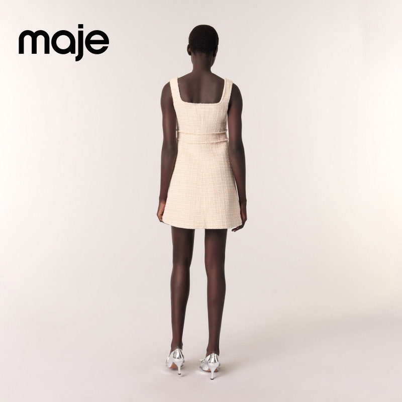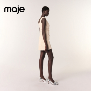 短款 Maje2025春夏女装 粗花呢米黄色方领无袖 时尚 吊带连衣裙 法式