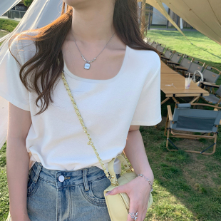 设计感纯棉内搭打底半袖 方领正肩t恤短袖 法式 薄款 体恤上衣 女夏季